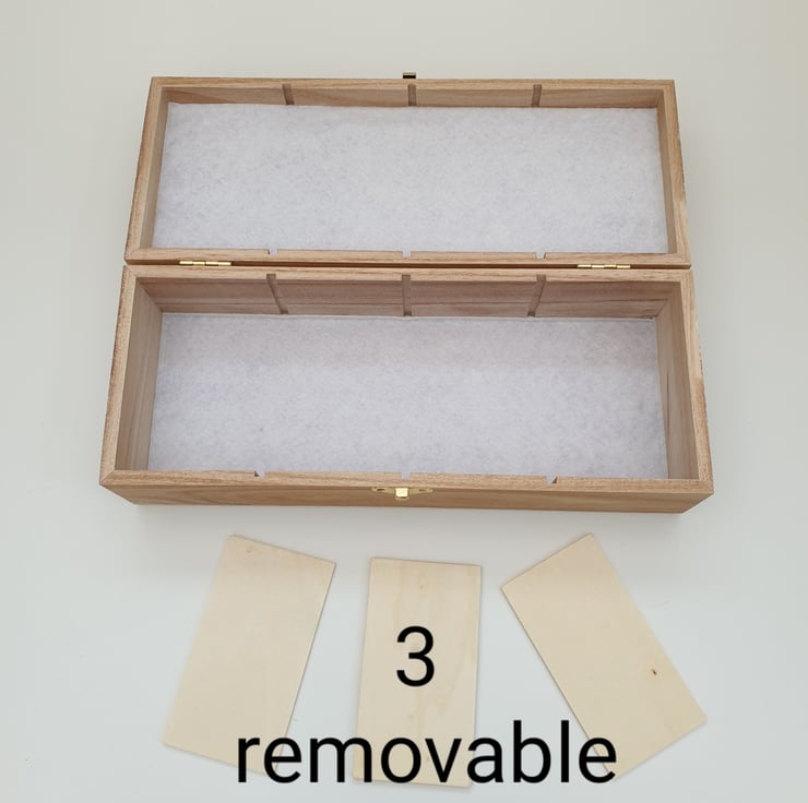 This decorative box would be ideal for jewellery, storing trinkets, beads, craft supplies, playing cards, tea bags, seed packets, craft supplies, hair accessories, pens and pencils, etc. The dividers can be removed entirely to leave one long box or inserted to meet your needs.