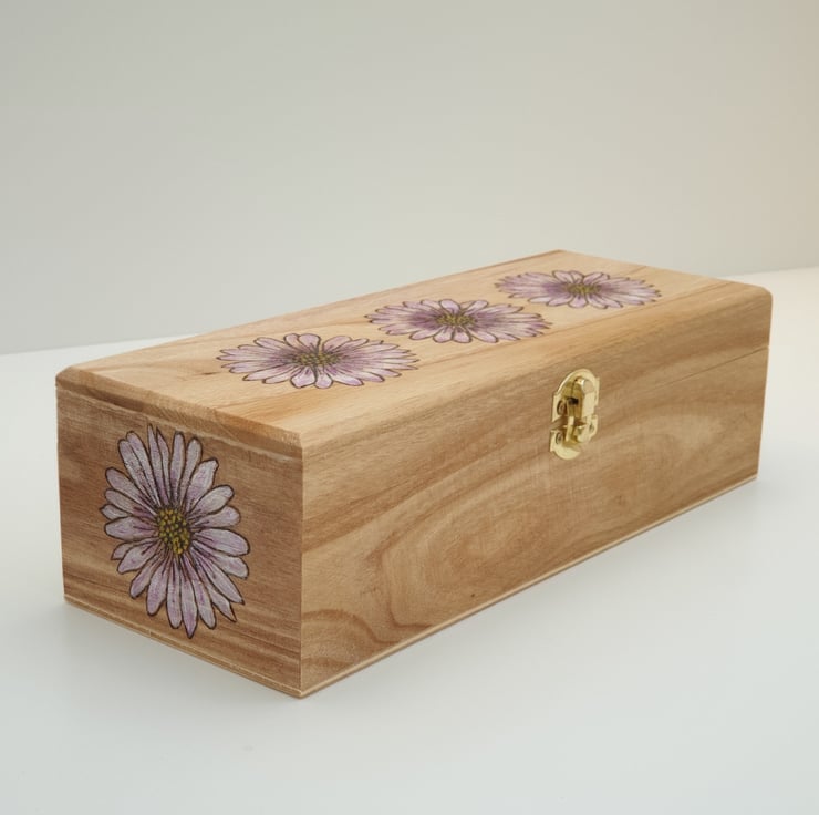 Lovely long wooden jewellery box or storage box which has been lovingly handburnt using pyrography with daisy flowers and coloured with metallic acrylics. The box has a metal clasp and 4 compartments. The box has wooden inserts which are easily removable so you can change the internal dimensions . The box exterior has been finished with wood oil to enhance the natural beauty of the wood. The interior of the box has been lined with white felt.