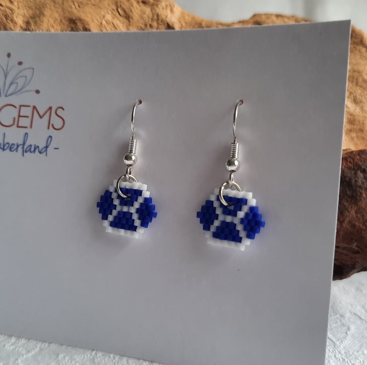 This lovely pair of light weight beadwork earrings are made using Japanese Delica beads in the theme of the flag of St Andrew. They have a drop of approx. 1.2cm from the base of the ear wires and are approx. 1.5cm in width. They have silver plated findings but these can be changed to sterling silver at check out.