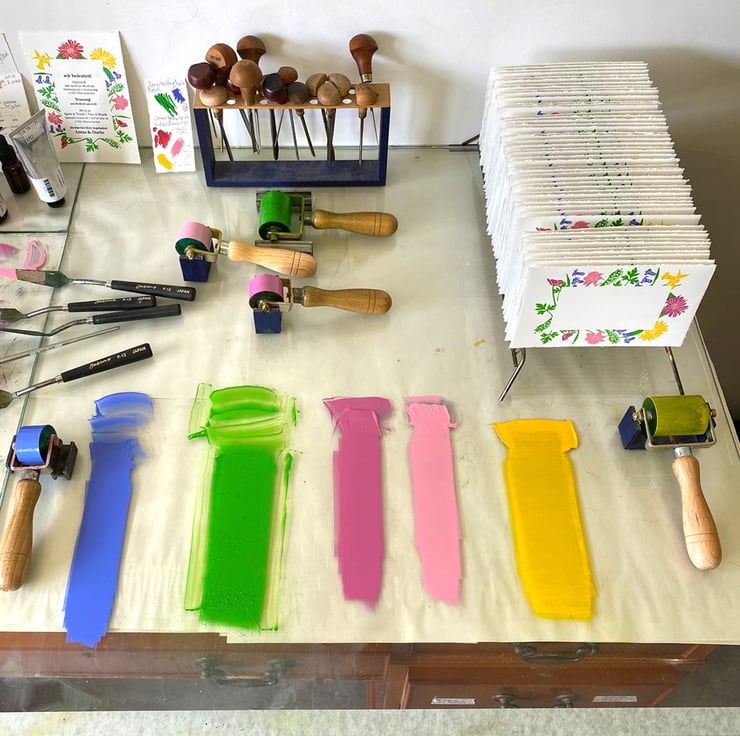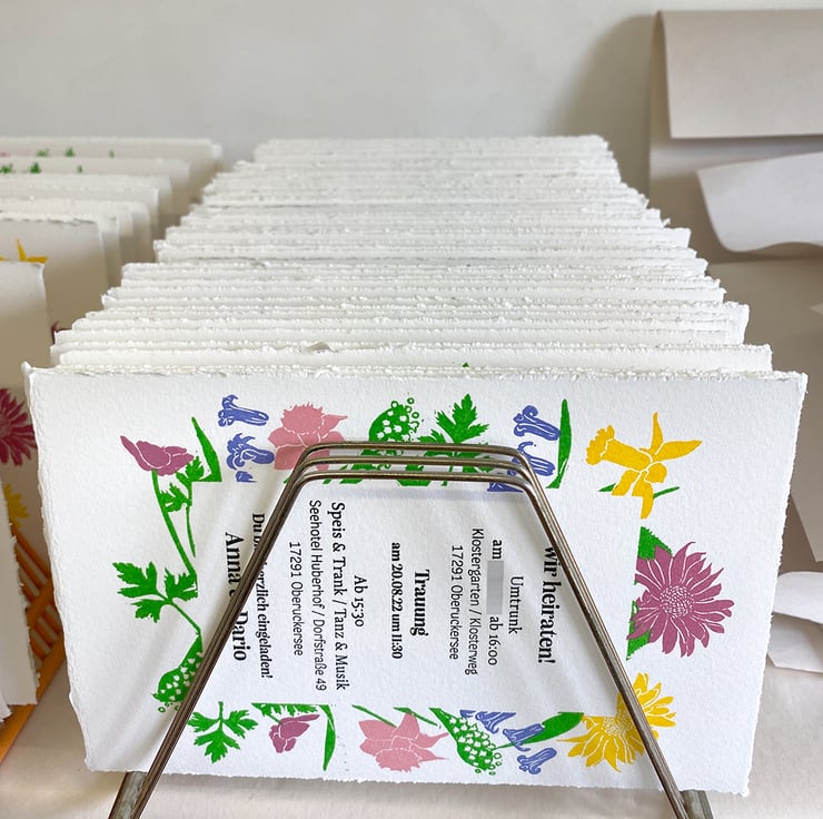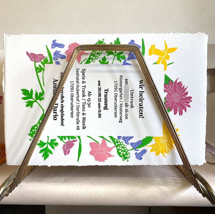 The image in this invitation is linocut which I designed, cut & printed. This invite was for a couple in Germany