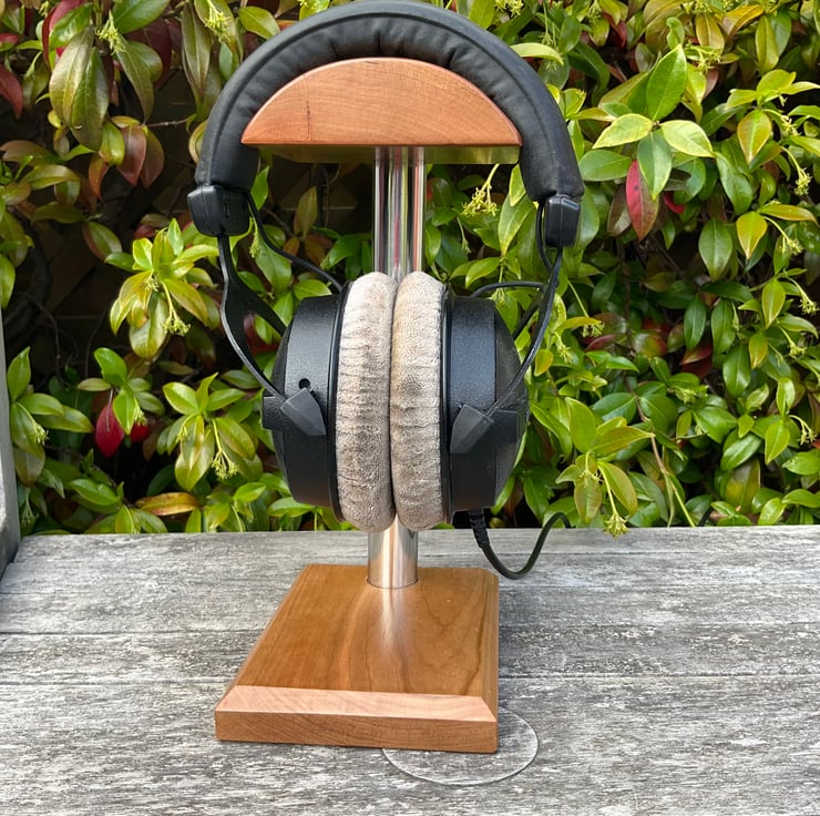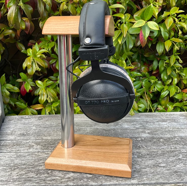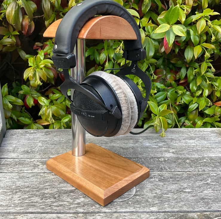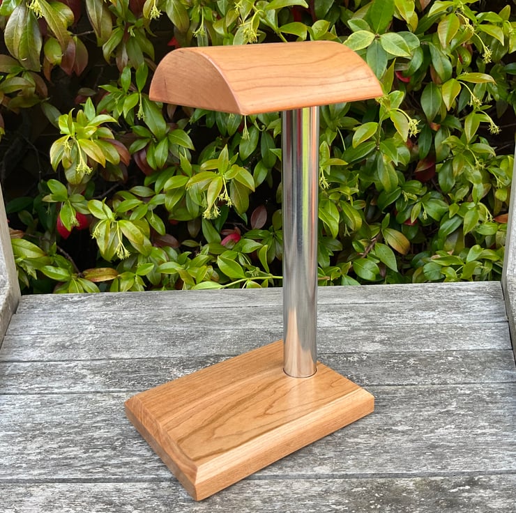 An elegant and attractive headphone stand in cherry wood and stainless steel. The functional design is suitable for wireless or wired headphones from small to large size. The stand provides the perfect storage solution when phones are not in use. An ideal gift for fathers day, music lover or providing a stylish addition to the home office.