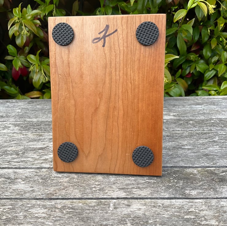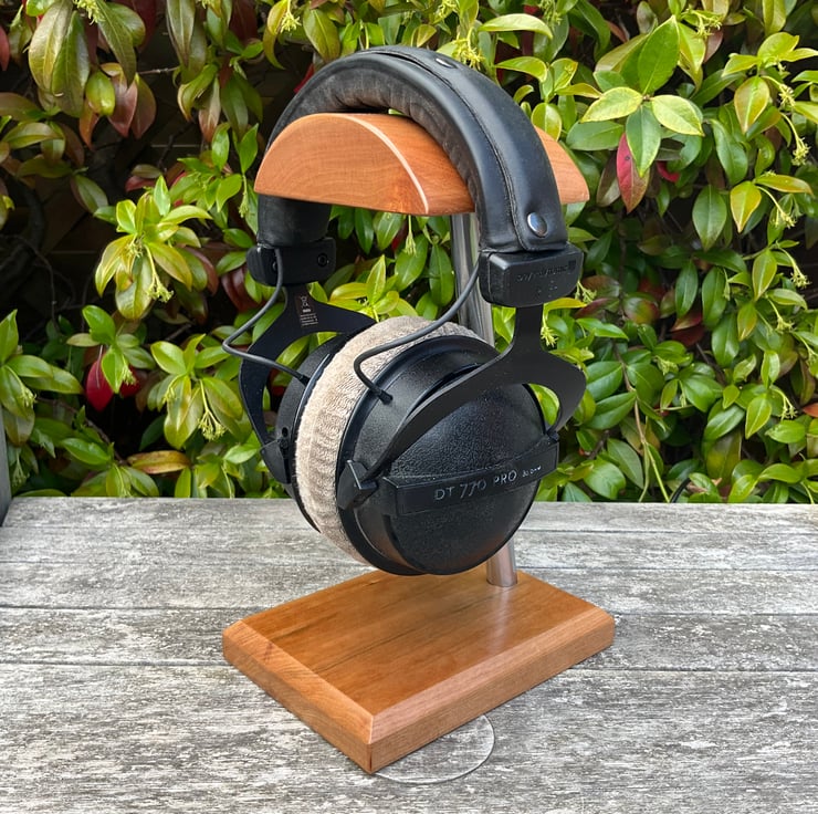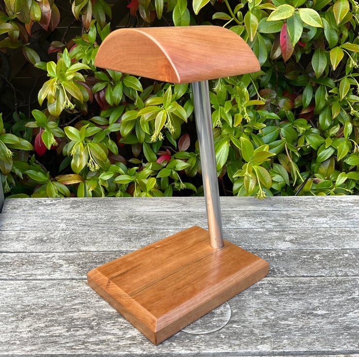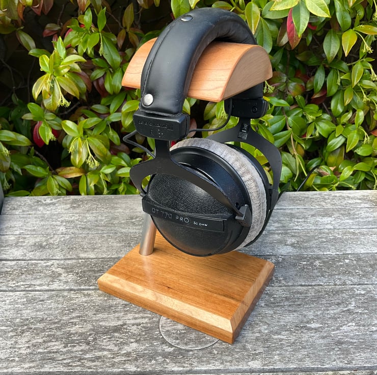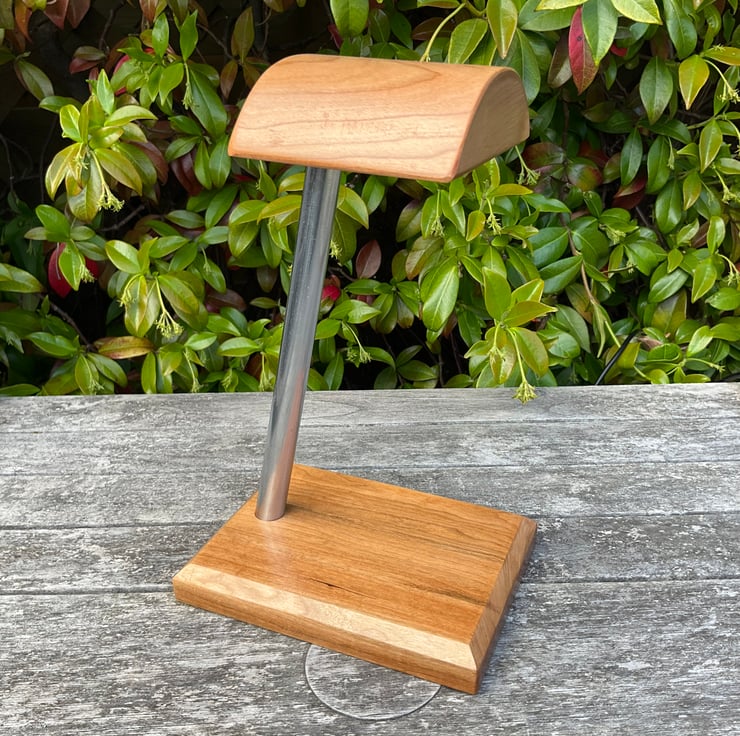 An elegant and attractive headphone stand in cherry wood. The functional design is suitable for wireless or wired headphones from small to large size. The stand provides the perfect storage solution when phones are not in use. An ideal gift for fathers day, music lover or providing a stylish addition to the home office.
