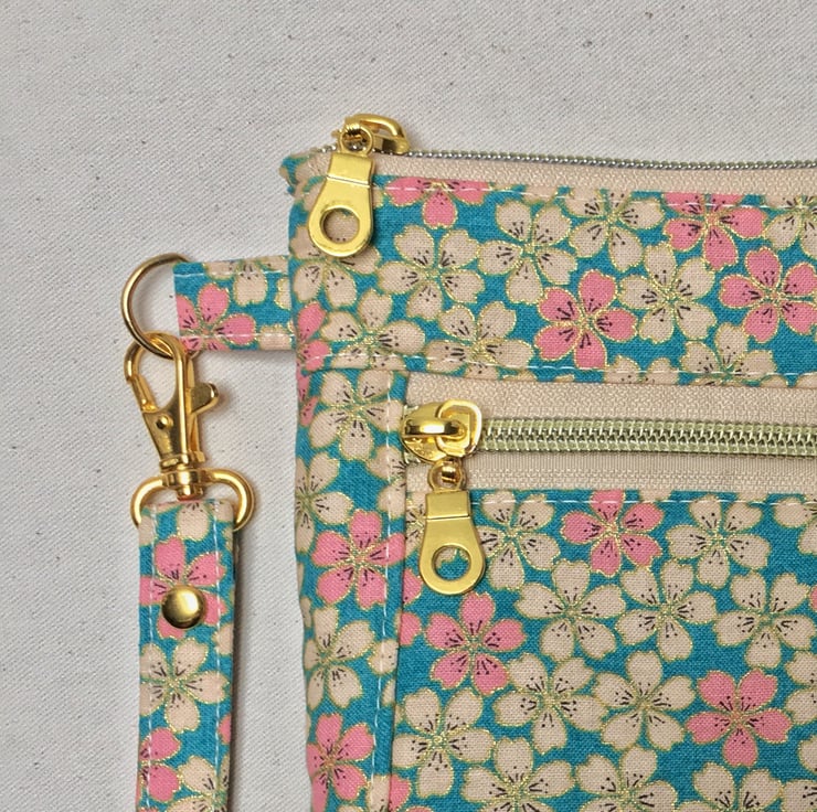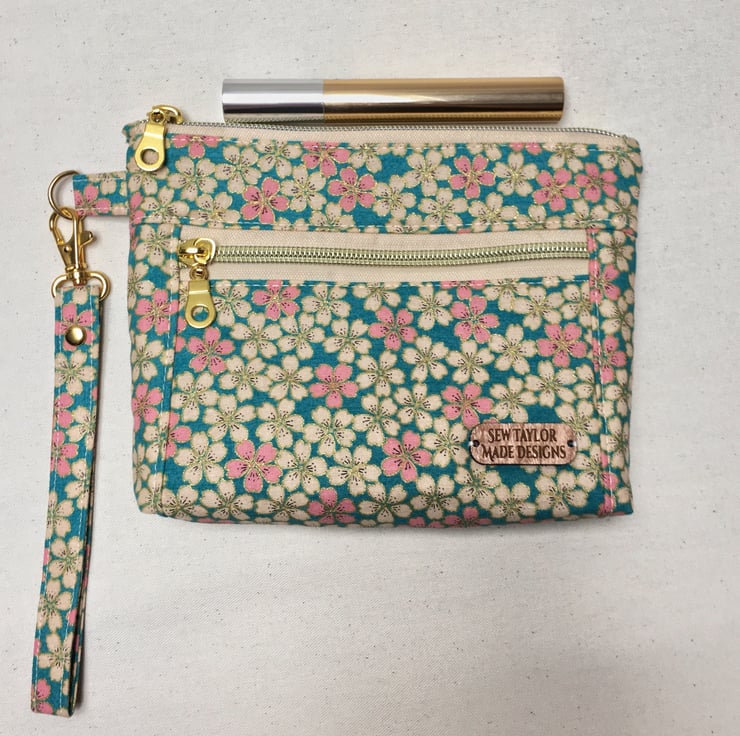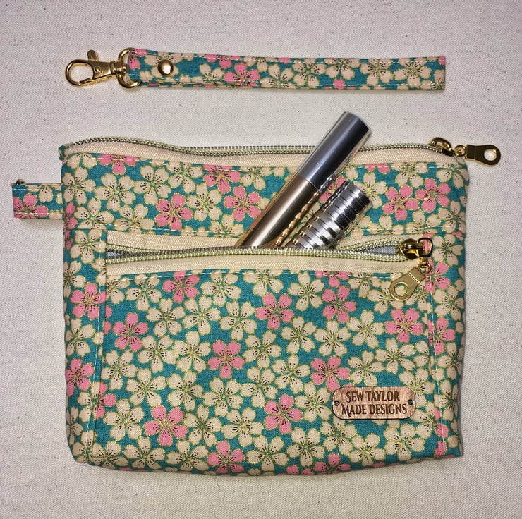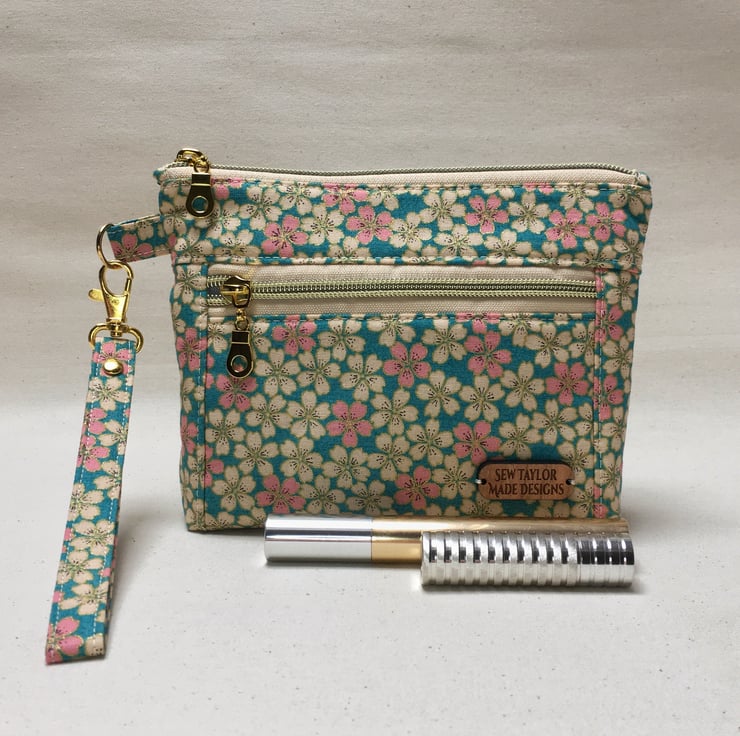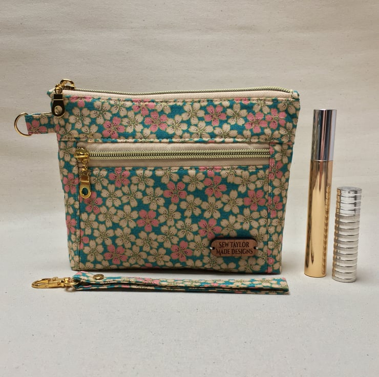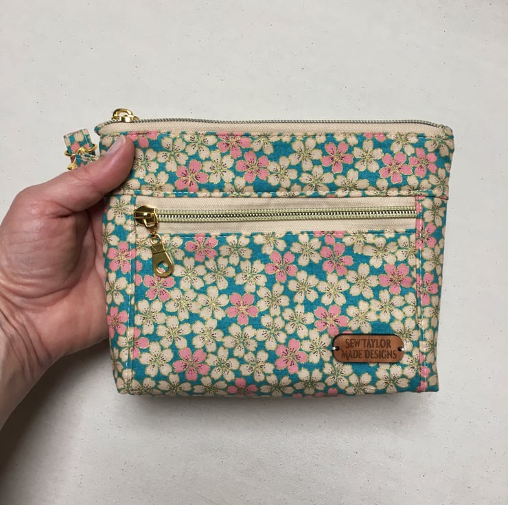 This eye catching handmade Devon Zipper Pouch is made from beautiful Japanese floral cotton fabric. The pink and cream blossoms are accentuated by gold outlines on a turquoise background.