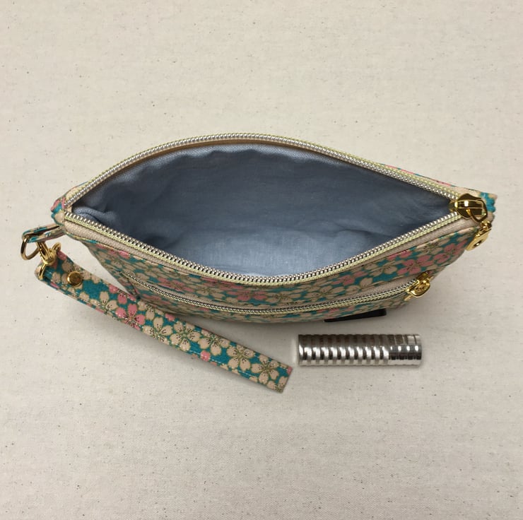 It features two zippers with gold metal sliders measuring 18 and 15 cm (7 and 5.75 inches) as well as a detachable wrist strap that measures 15 cm (6") in length.