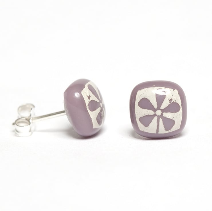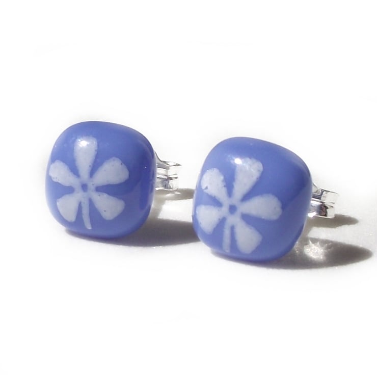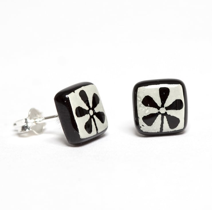 Tiny white daisies are screen-printed by hand onto bright coloured opaque glass to create these floral stud earrings. If you would like the flowers printed in black glass enamel, this listing can be found in the Earring Collection in my shop.