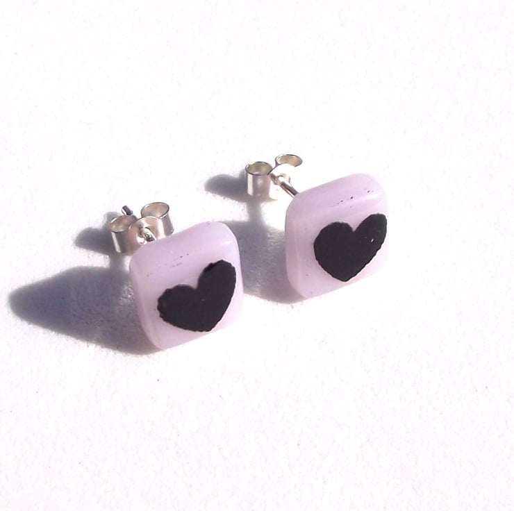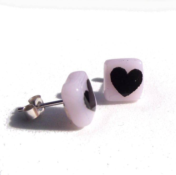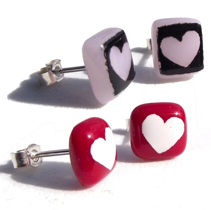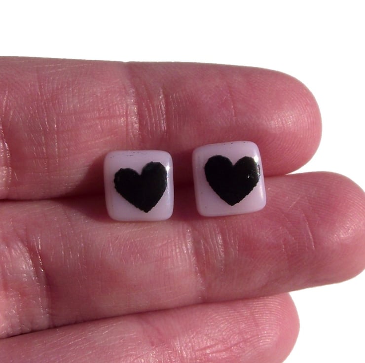 Tiny black hearts are screen-printed by hand onto bright coloured opaque glass to create these love heart stud earrings. If you would like the hearts printed in white glass enamel, this listing can be found in the Earring Collection in my shop.