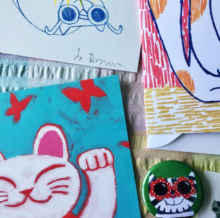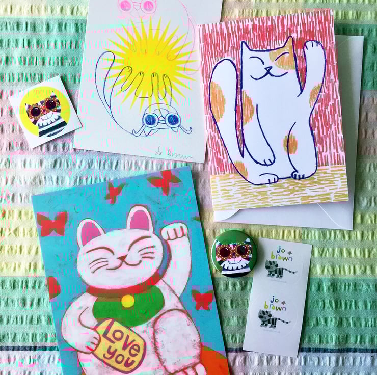 This letterbox-sized pack includes one 5 x 7 inch digital print of a Lucky Cat, one A6 greetings card of a maneki neko lucky cat, one riso print of two cats and a sunburst, one sunglasses cat badge, one sunglasses cat sticker. Please note pin badges are not suitable for children.