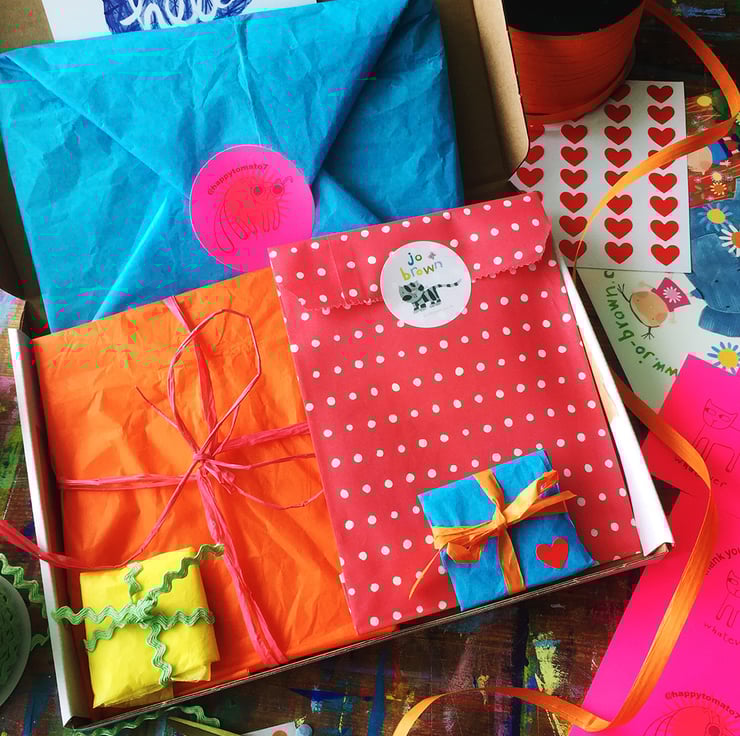 Happy colourful gifts by Jo Brown, can be sent direct to recipient, with a handwritten note.