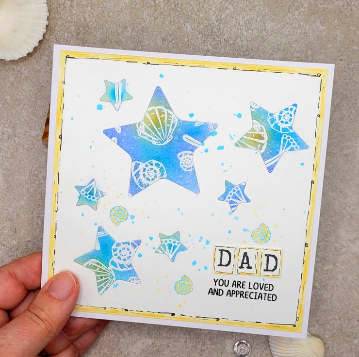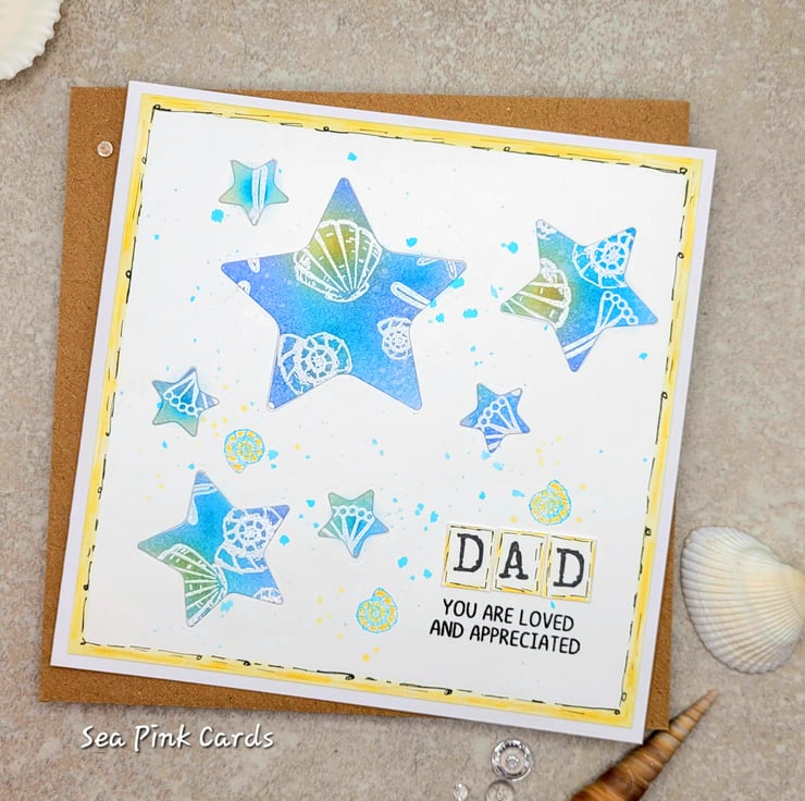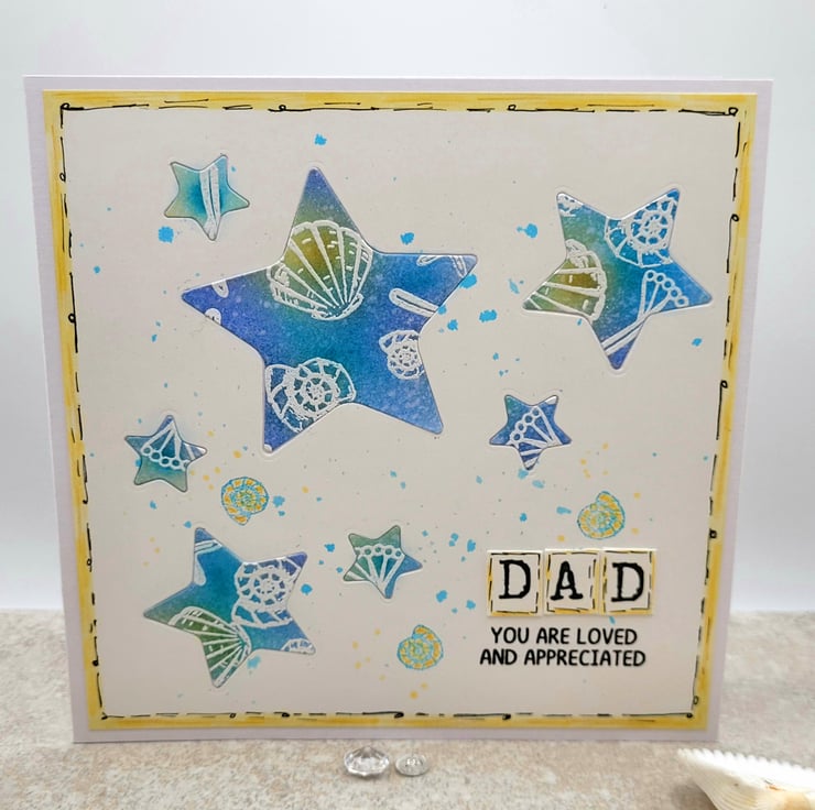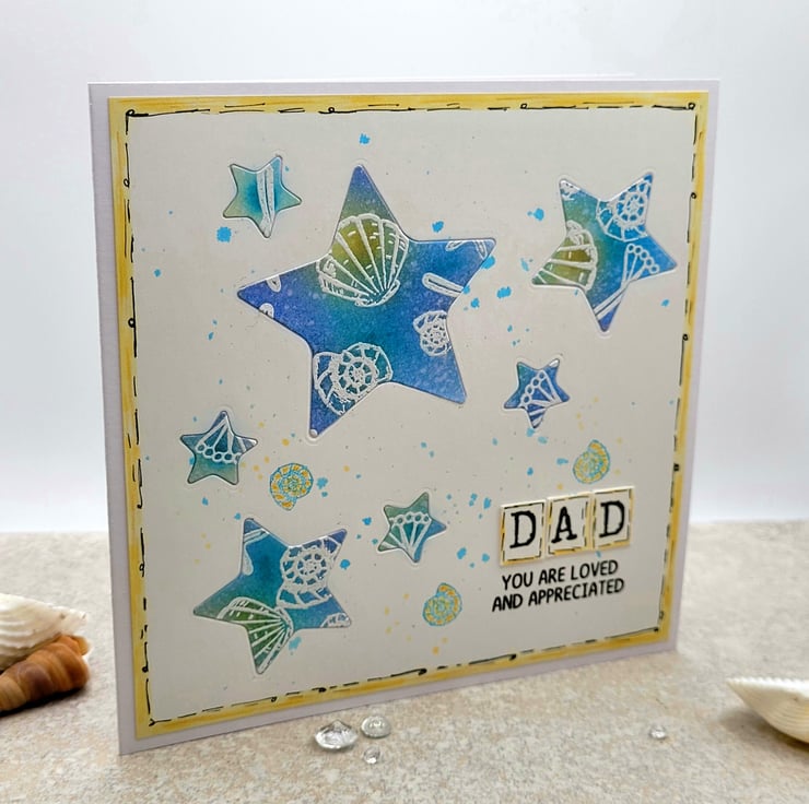 Quality white recycled card has been used to make the card base and there is a layered white focal panel on top with cut out star shapes. The stars have been inlaid with handmade patterned card featuring heat embossed shells and starfish. An ink blended border has been decorated by hand with a black fine liner pen.