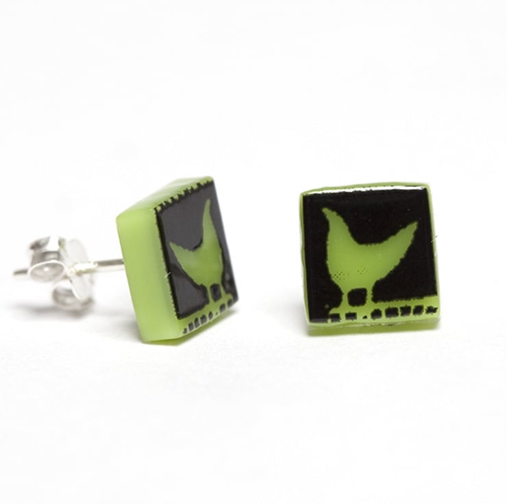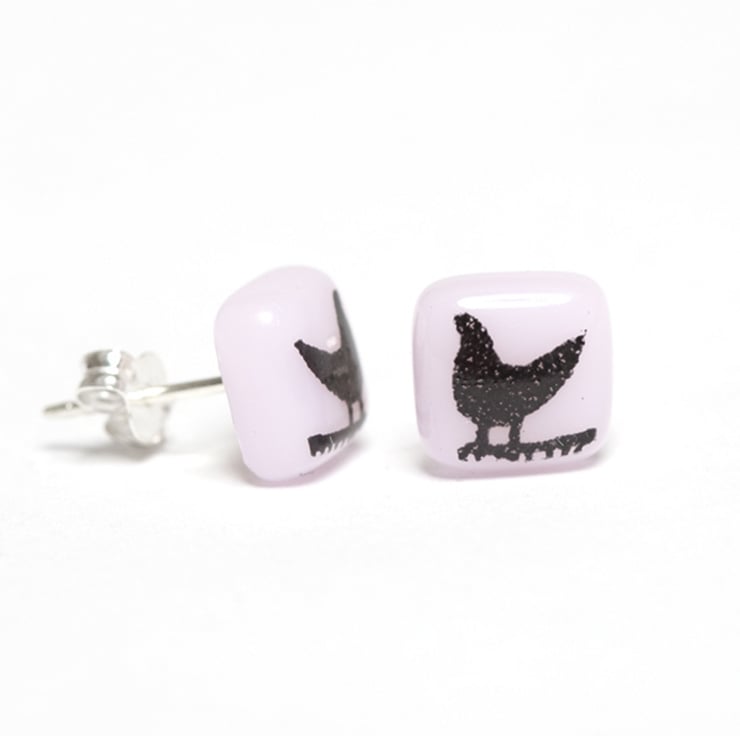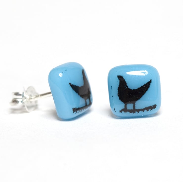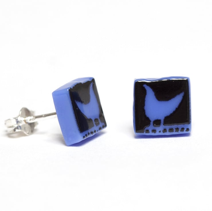 Tiny black birds are screen-printed by hand onto bright coloured opaque glass to create these tweet stud earrings. If you would like the birds printed in white glass enamel, this listing can be found in the Earring Collection in my shop.