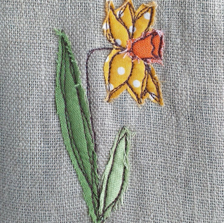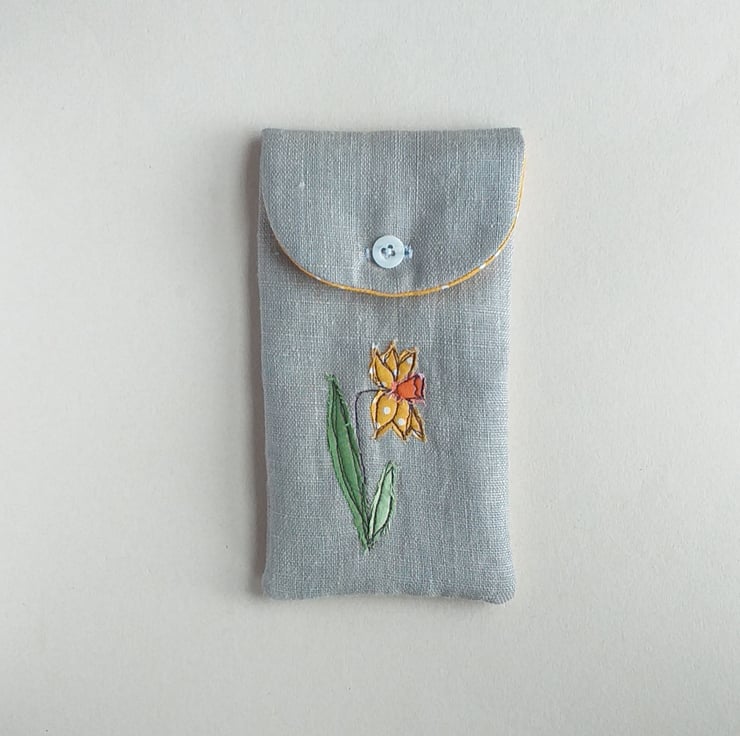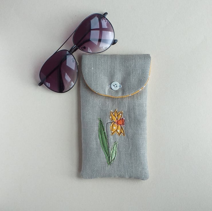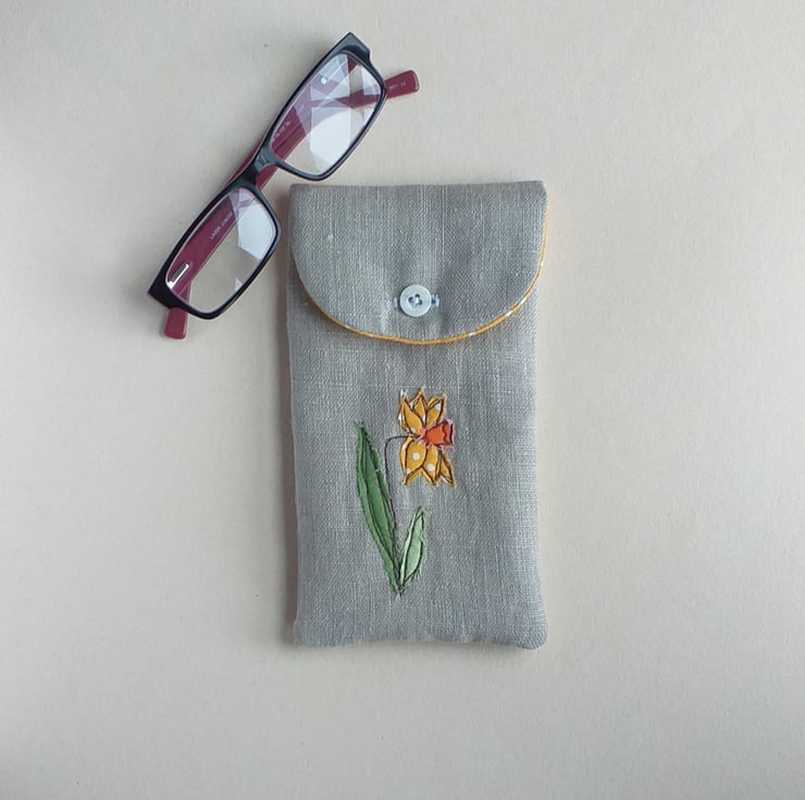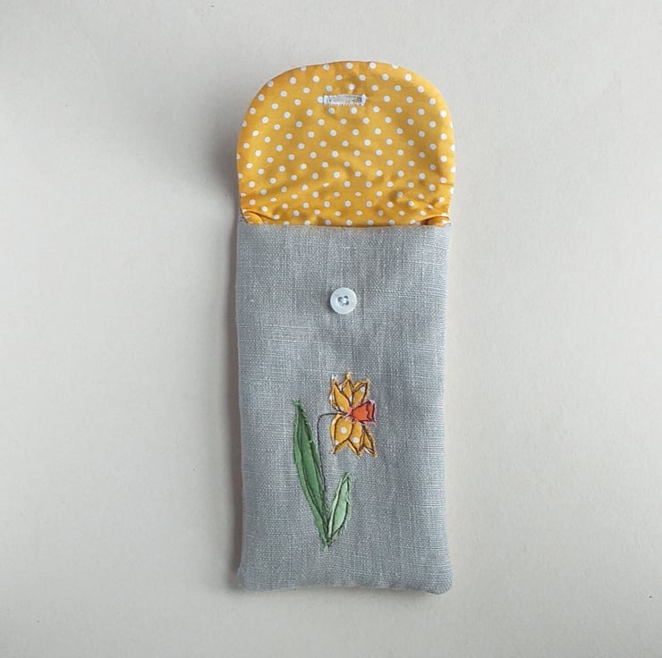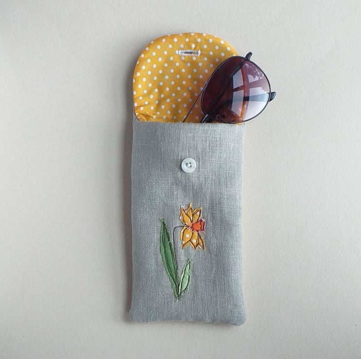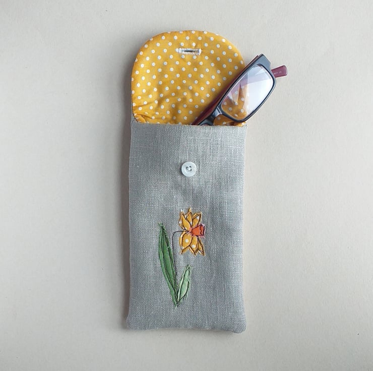 This is a soft but padded specs case, perfect for reading glasses or sunglasses. It has a daffodil design made from appliqued fabric sewn with free motion embroidery onto linen, a cheerful toning yellow spotty lining and a button down flap. The closed case measures approximately 18cm high and 9cm wide.