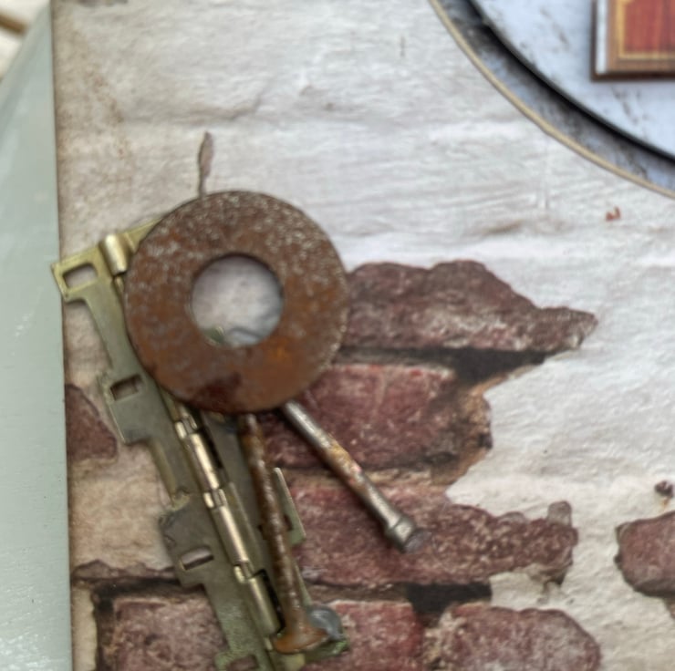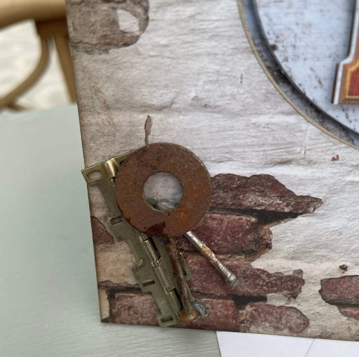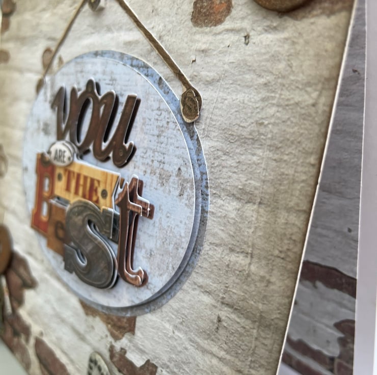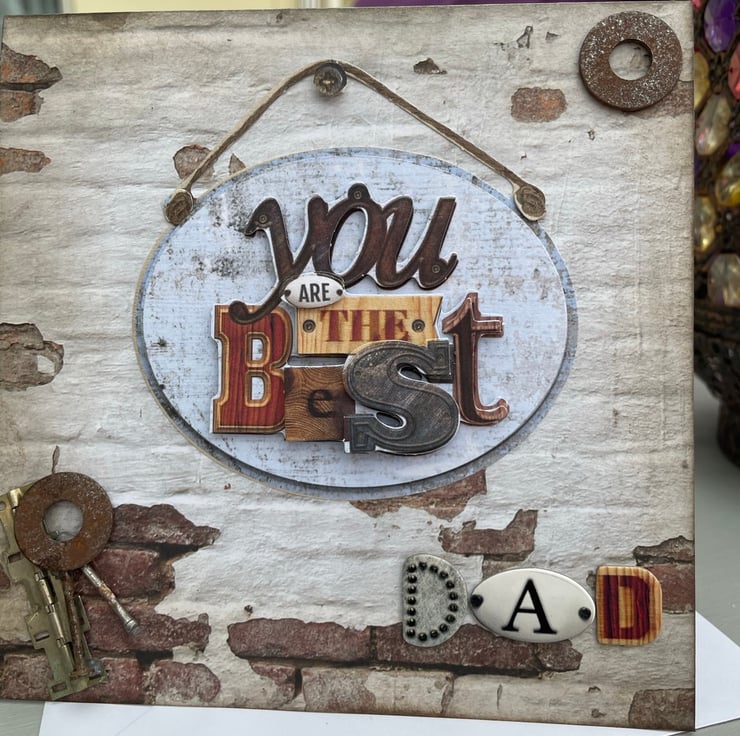 Grungy and masculine, an unusual and fun way to celebrate Father's day or a birthday. This 15x15cm square card has a funky flaky paint and brick wall paper as the base. This has been inked to age it around the edge. The main image is a decoupaged layered plaque that says You are the best. This 'hangs' from a screw. Thick matching stickers spell out Dad in the corner. This design is finished with some bits and bobs from the garage - rusty washers, nails and a hinge, truely authentic from my own stash of bits! Inside the card has matching paper and a bookplate style decoration that says Dad. A unique way to celebrate Father's day.