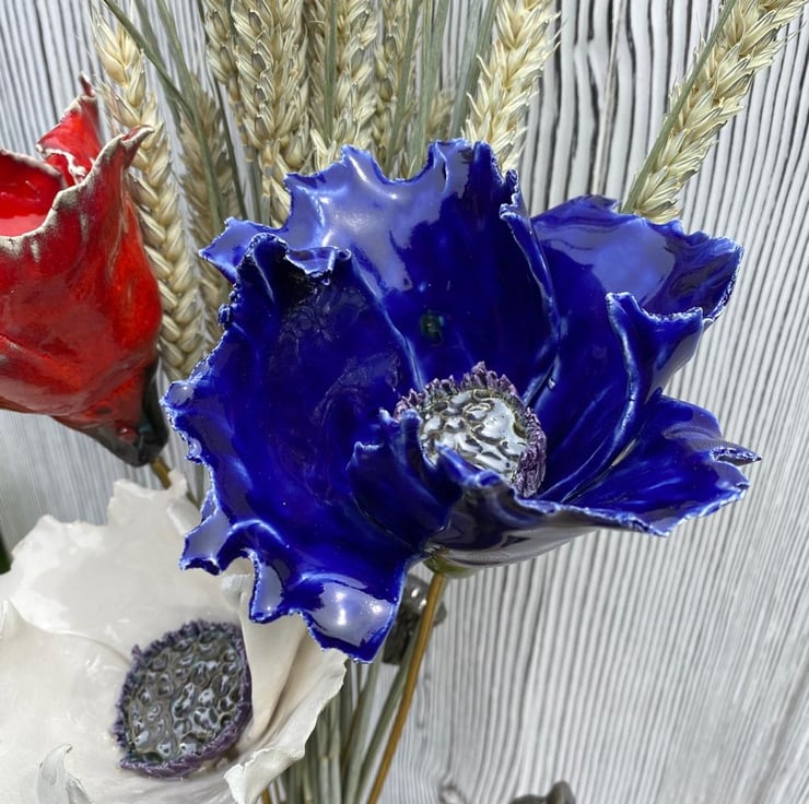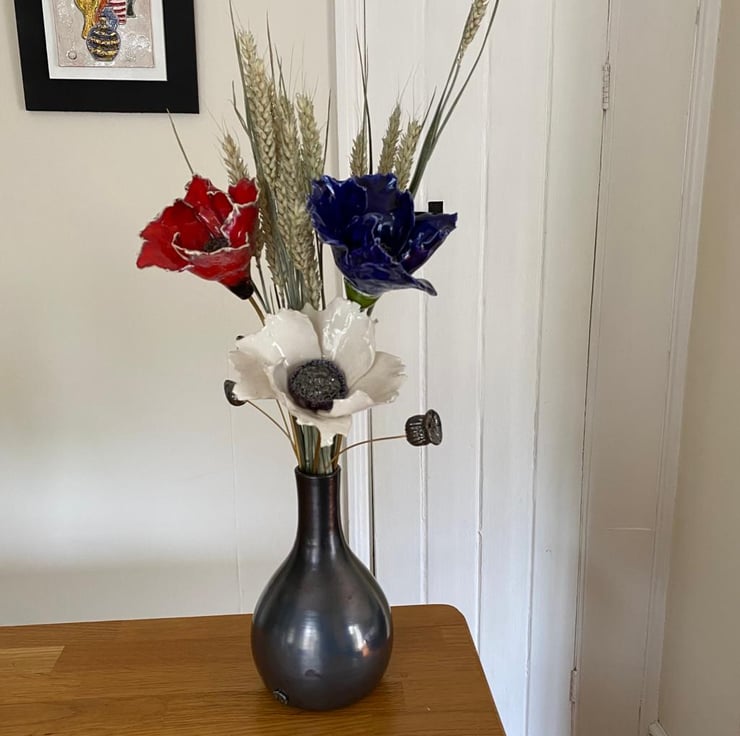 The ceramic glaze used to colour the Poppy gives each flower a timeless quality which will never fade or age, the flower will always look fresh and bright in your display and brighten your room. The Centre of the Poppy has a shiny pewter black glaze finish. Every flower is stamped with a makers mark.