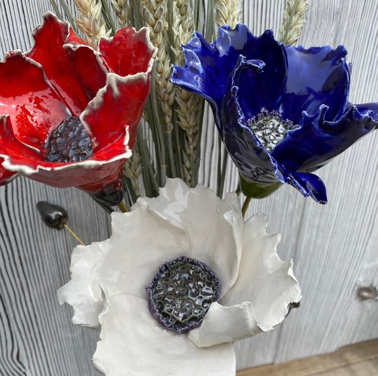 3 ceramic poppies in Red, White and Blue