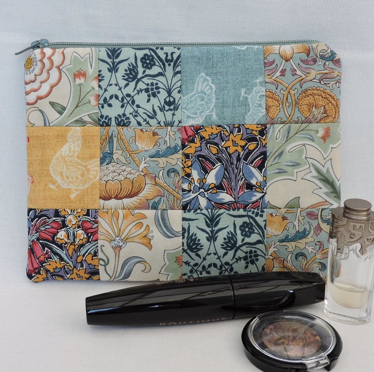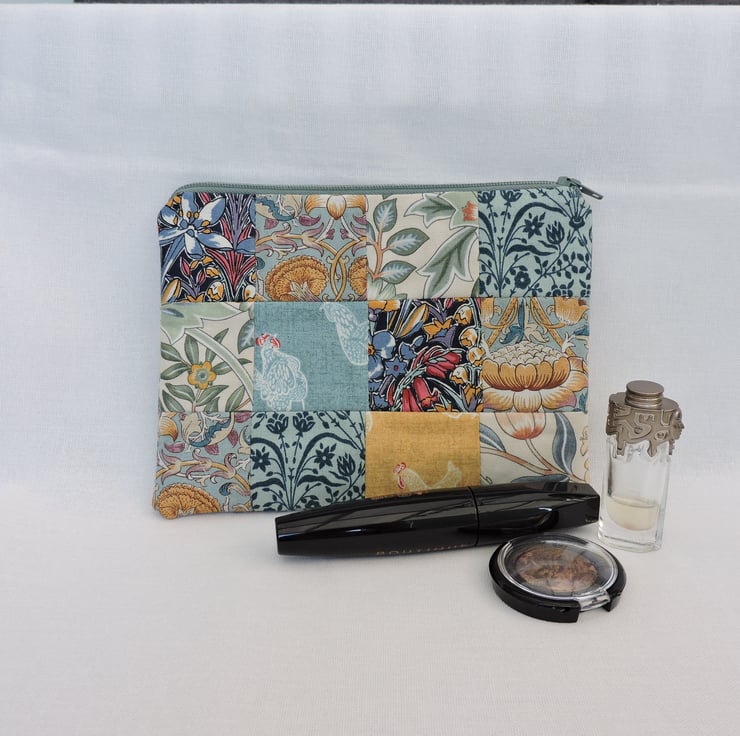 A patchwork make up bag which I have made with assorted cotton fabric squares. Mainly floral squares with a smattering of chicken squares. The colours are golden yellow, blue, cream, green, red. The inner fabric is a two tone blue floral cotton fabric. Interfacing has been used to give stability to the bag and is finished with a pale sage green top zip.