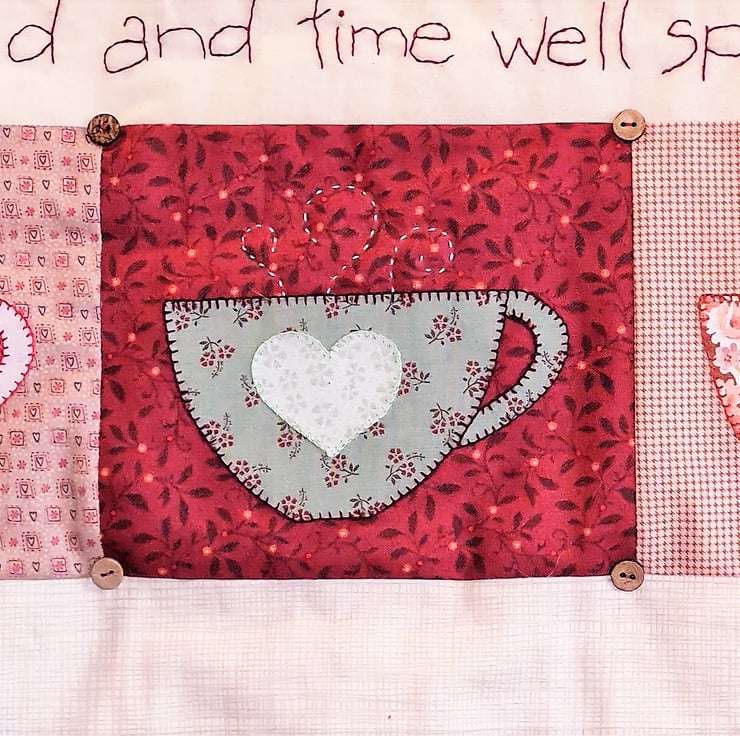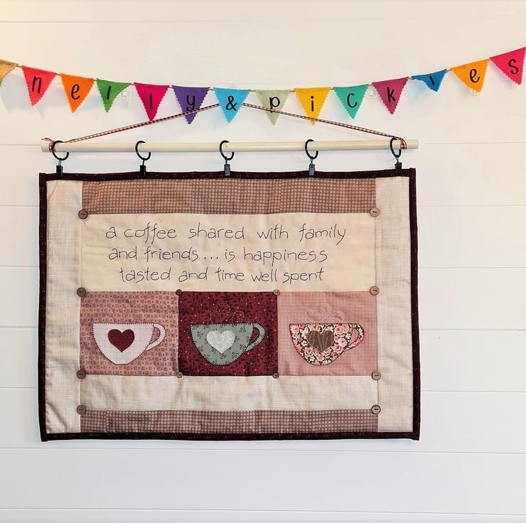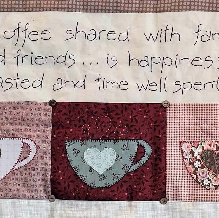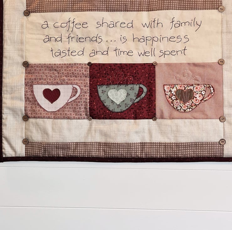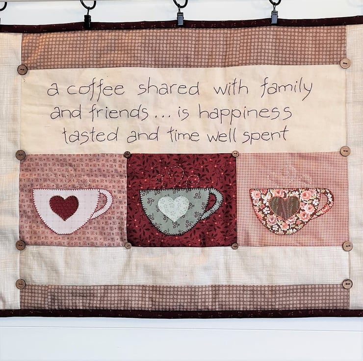 A quilted wall hanging for the coffee lover in your life! Handstitched with 100% cotton in a range of rich, coffee themed shades. The three coffee cups have their own heart decoration and swirls of steam - you can almost smell the coffee! The meaningful sentiment is handstitched. It is backed and bound in co-ordinating fabric and trimmed with coconut shell buttons.The quilt is suppled ready to hang, as seen in the photos. It measures approx 24 inches/61 cm across and 17 inches/43 cm in height.