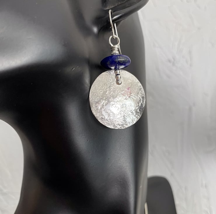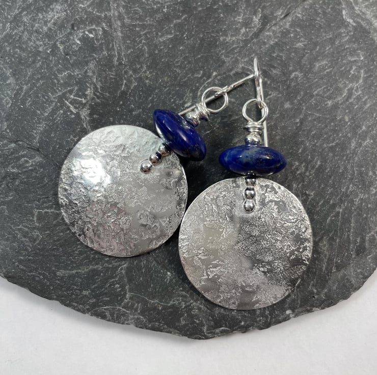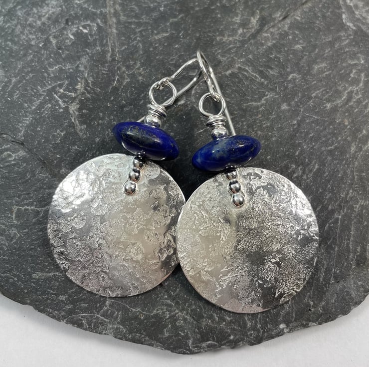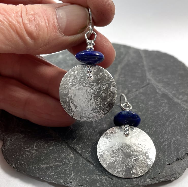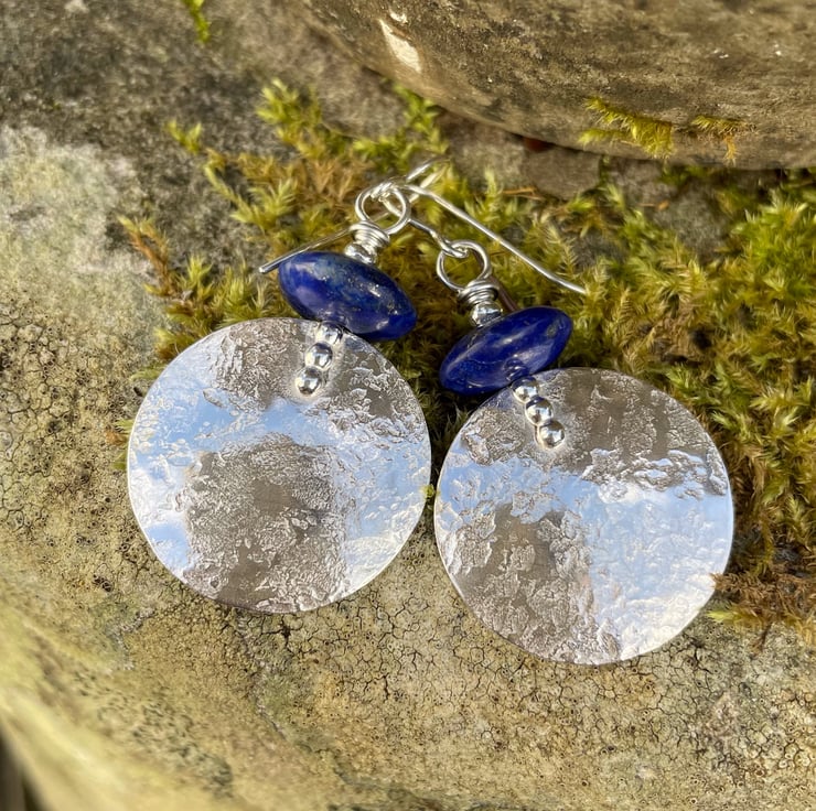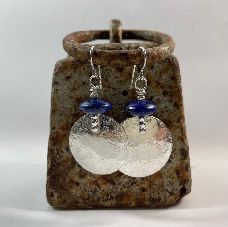 Beaten dished discs of silver have been topped with hand cut lapis lazuli beads and hung from handmade hooks.