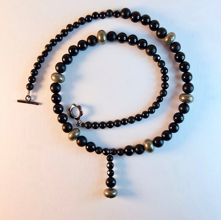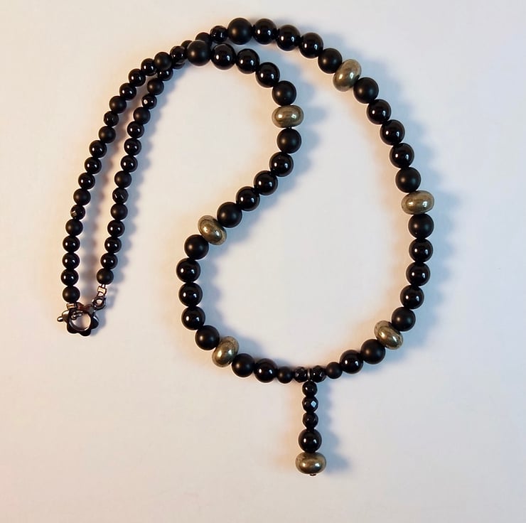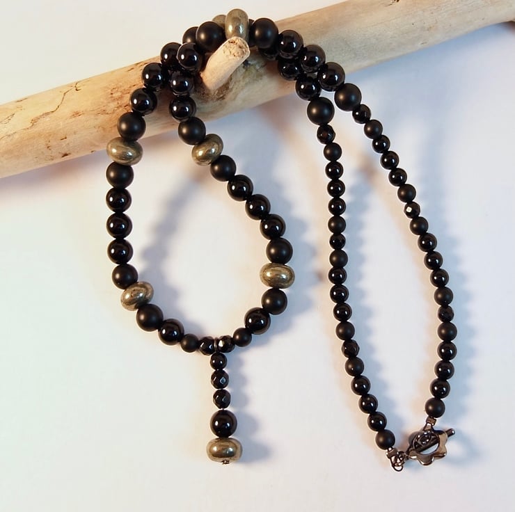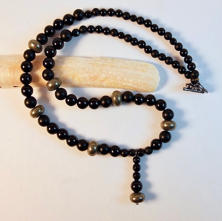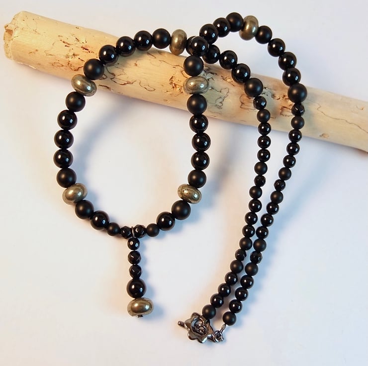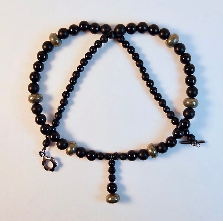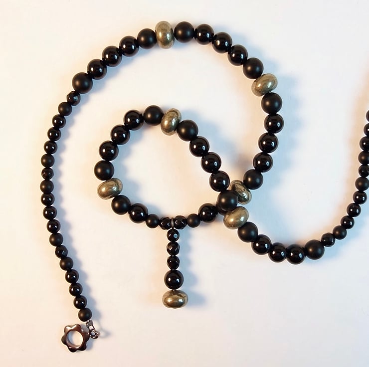 As a centrepiece I have added a pendant featuring a pyrite rondelle, 6mm polished black Agate and a trio of 4mm faceted black Onyx beads. The pendant is just under 1 inch (2cm) in length.