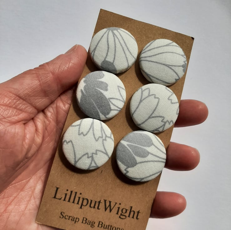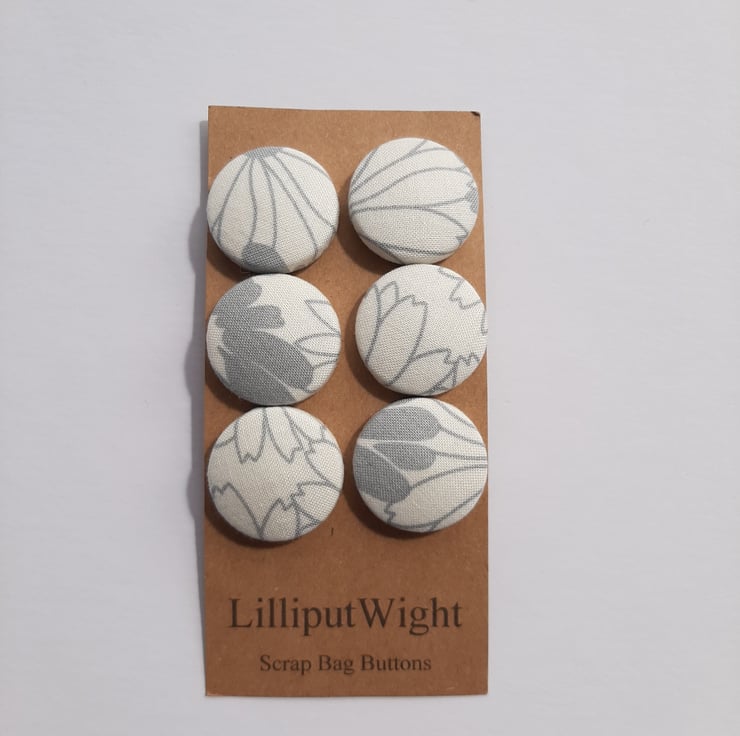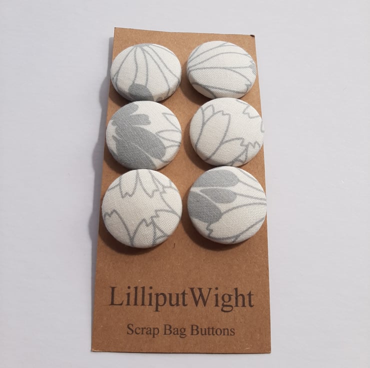 This set of six buttons are metal buttons covered with scraps of white fabric with a mid scale grey floral print. The print is abstracted by the off set placement of the print on the buttons. Each button is around 3cm across.