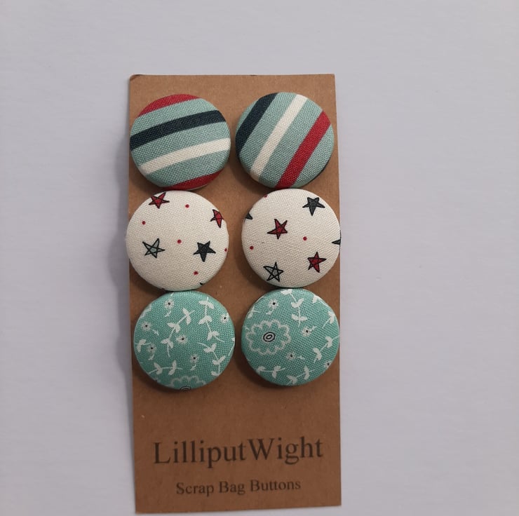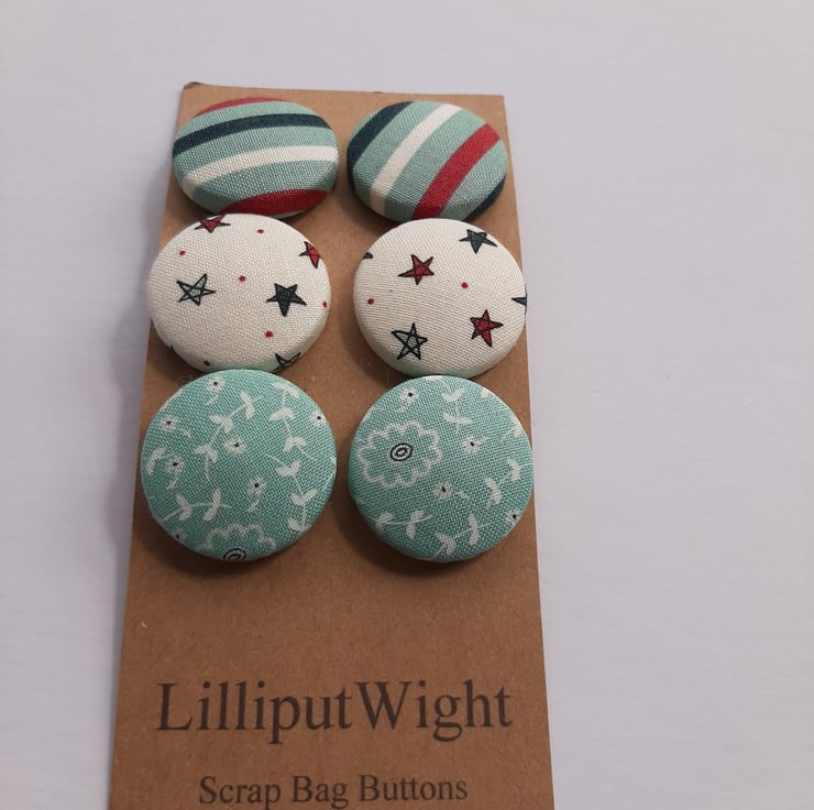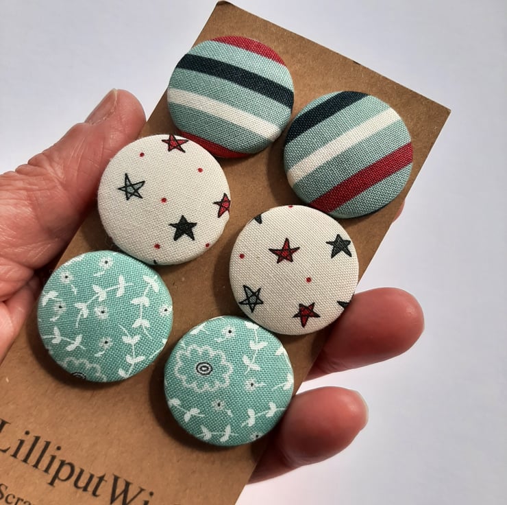 This set of six buttons are metal buttons covered with scraps of fabric. There are two each of three different fabrics from the same range. Stripes of white, navy, wine and teal; white with navy, teal and wine stars; and teal with dainty white flower and leaf motifs. Each button is around 3cm across.