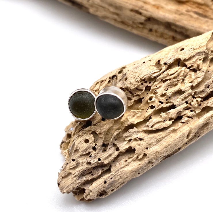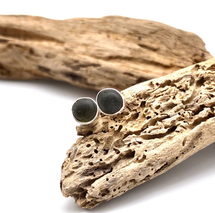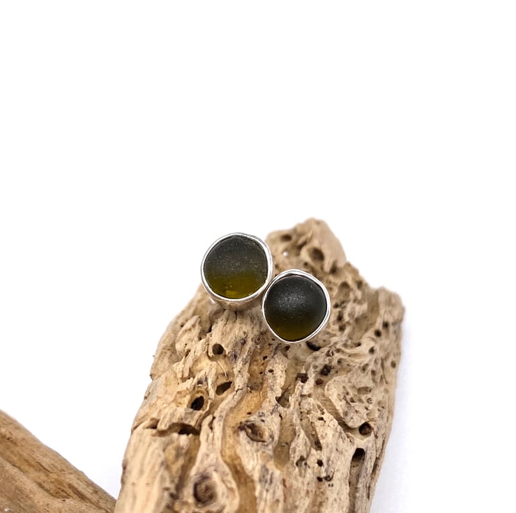 Olive green sea glass stud earrings. These pieces of sea glass have been hand picked from our beaches on the Isle of Wight.