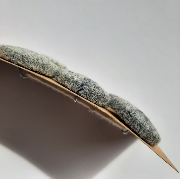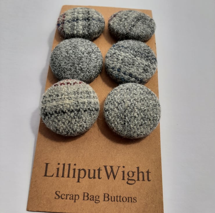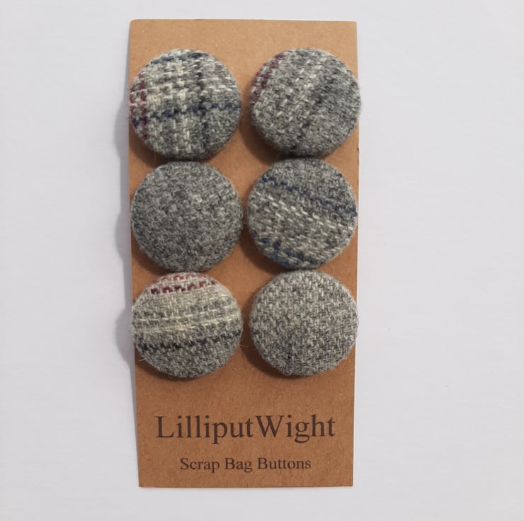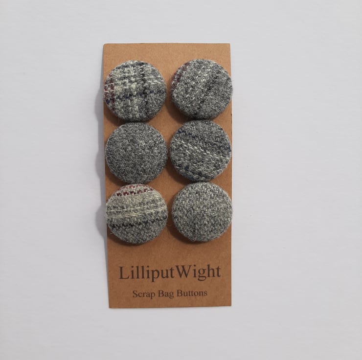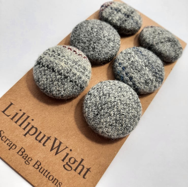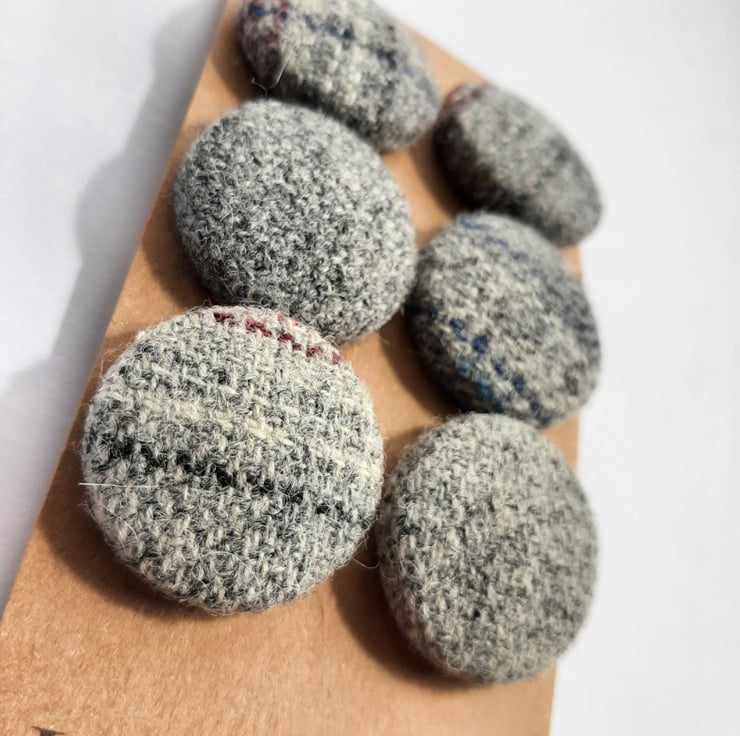 This set of six buttons are metal buttons covered with scraps of a grey wool fabric. Areas of the weave include blue/grey, white and wine wool which appears in different amounts on each button. Each button is around 3cm across.