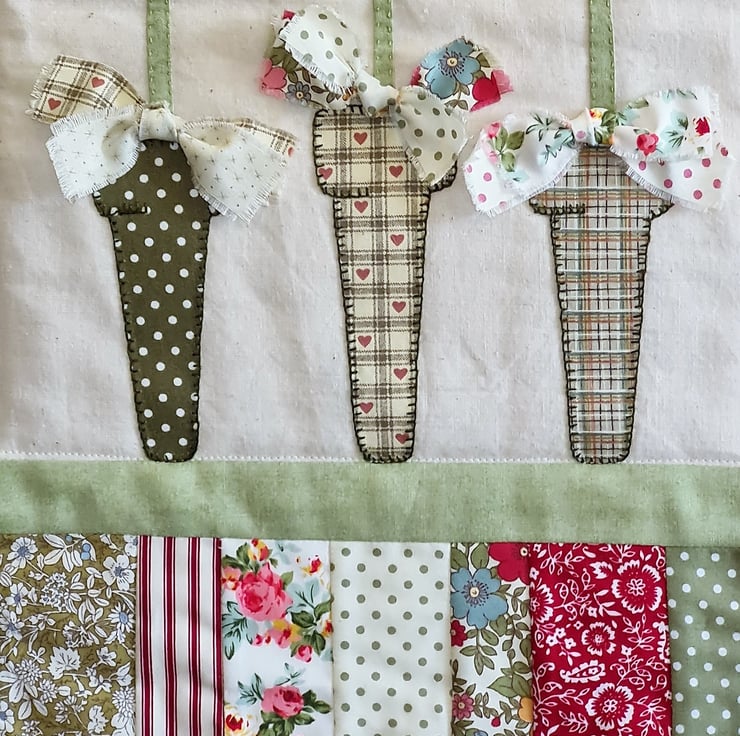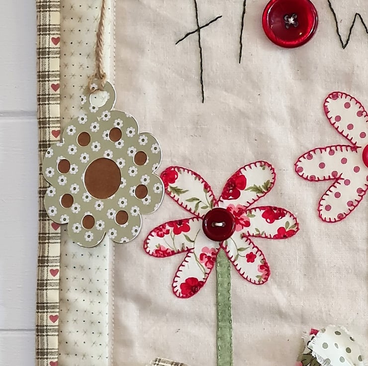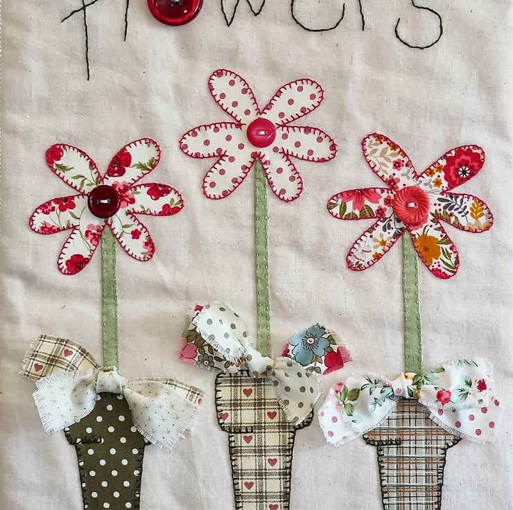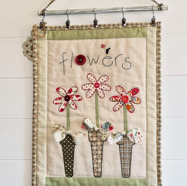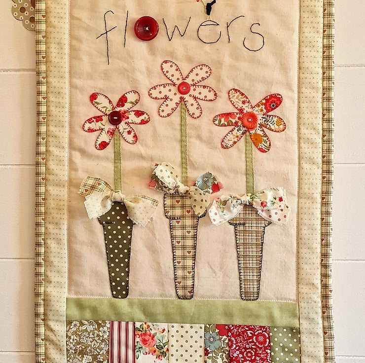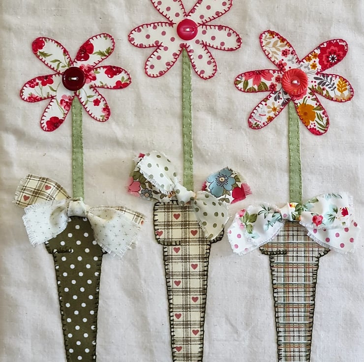 A bright, cheerful quilted wall hanging - perfect to show a special someone that you care. The quilt is handstitched with 100% cotton fabric, using applique and embroidery and trimmed with buttons.Three beautiful flowers standing in three pots, decorated with bows! A gift tag is attached with a cute pin.The quilt is supplied ready to hang, as seen in the photos. It measures approx 12 inches/30 cm wide and 20 inches/51 cm tall. It is backed and bound with co-ordinating fabric.