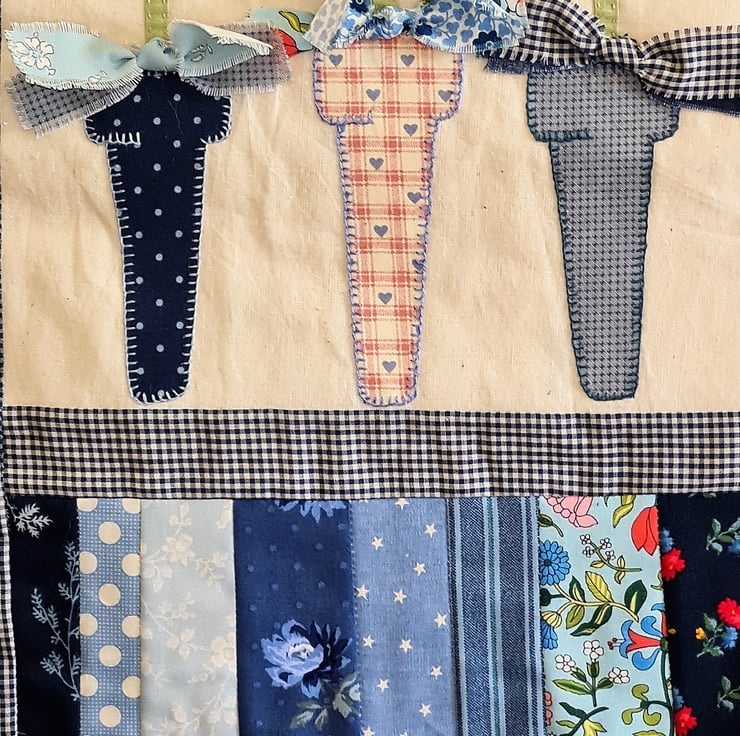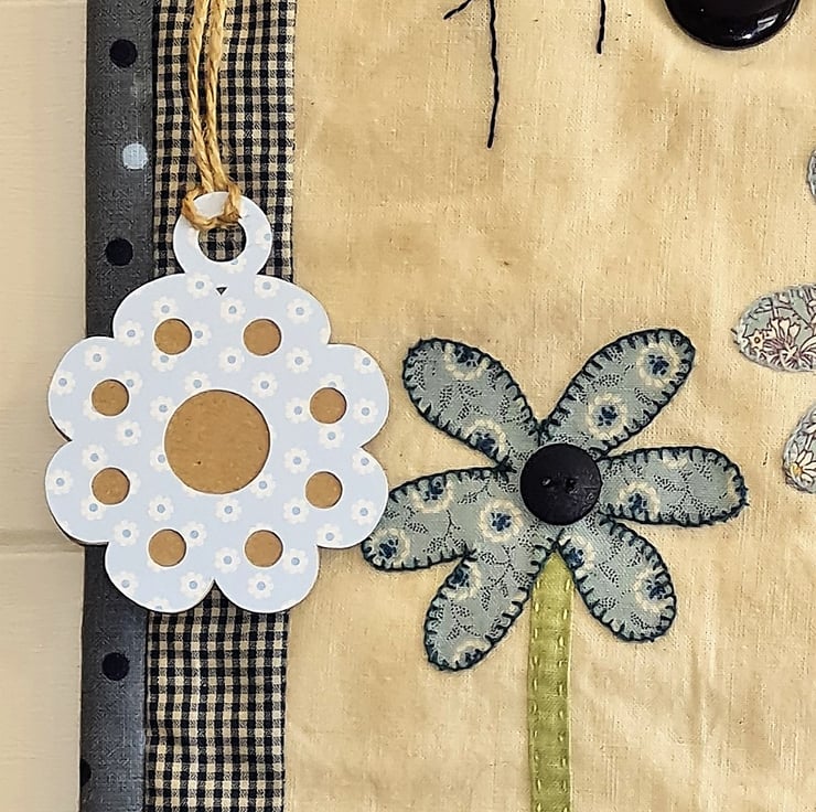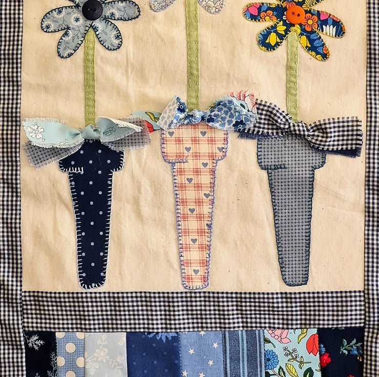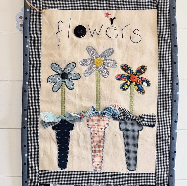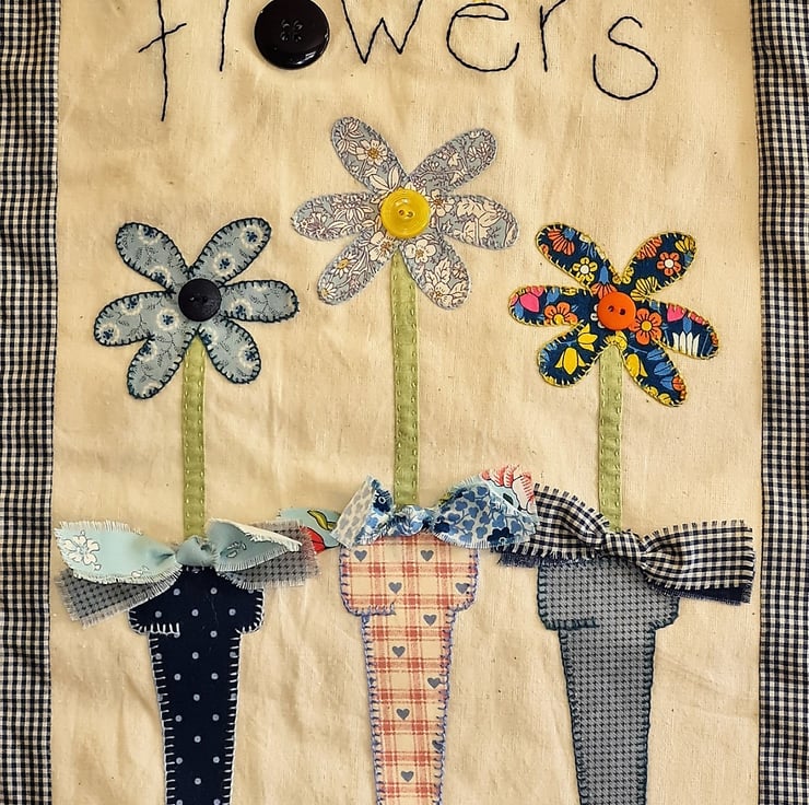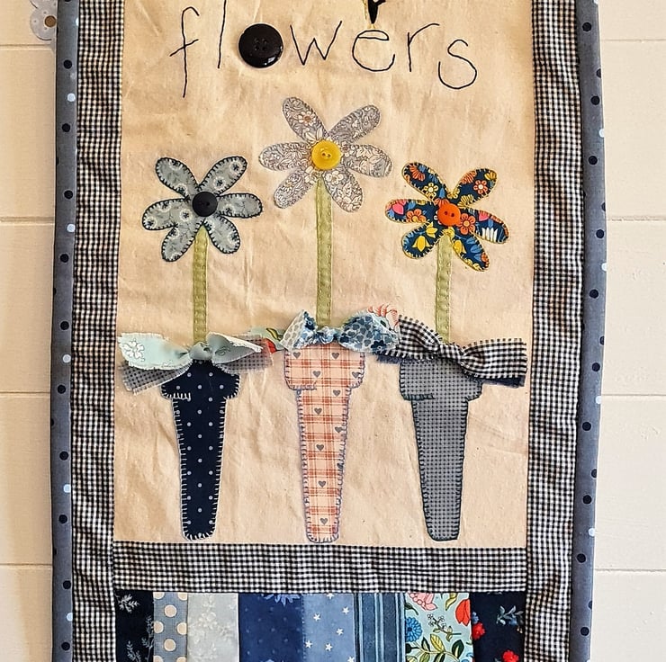 A bright, cheerful quilted wall hanging - perfect to show a special someone that you care. The quilt is handstitched with 100% cotton fabric, using applique and embroidery and trimmed with buttons.Three beautiful flowers standing in three pots, decorated with bows! A gift tag is attached with a cute pin.The quilt is supplied ready to hang, as seen in the photos. It measures approx 12 inches/30 cm wide and 20 inches/51 cm tall. It is backed and bound with co-ordinating fabric.