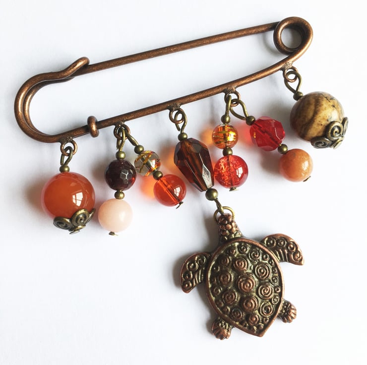 This pretty copper-tone kilt pin features a lovely Greek Mykonos turtle charm nestled among a selection of glass and semi-precious beads including Carnelian, Garnet, Pink Opal, Picture Jasper, glass drawbench, crackle glass and Czech fire-polished.