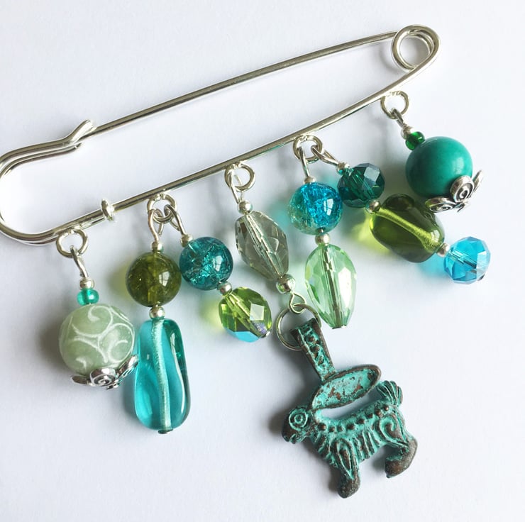 This pretty kilt pin features a Mykonos verdigris hare charm nestled among a selection of glass and semi-precious beads incuding carved Jade, Turquoise, Peridot, crackle-glass and Czech fire-polished.