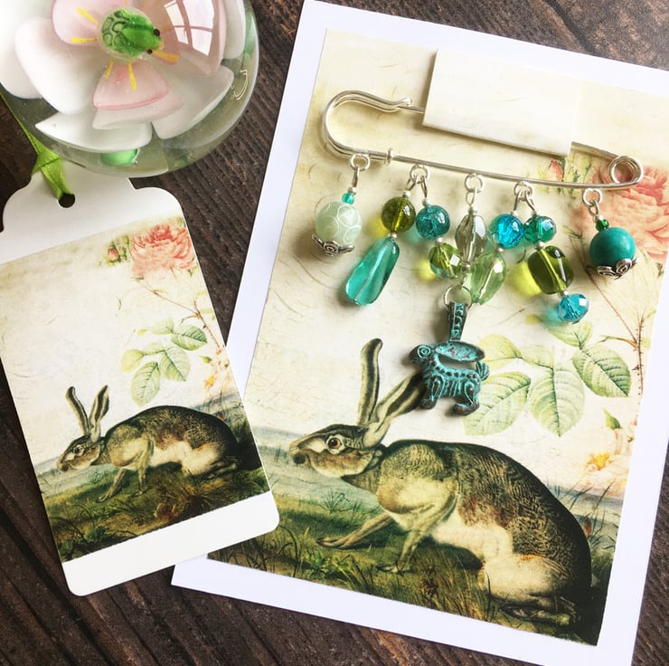 The pin measures about 7cm in length. I've presented it on a piece of stiff card decorated with a colour printout of a vintage hare. A matching gift tag is included.