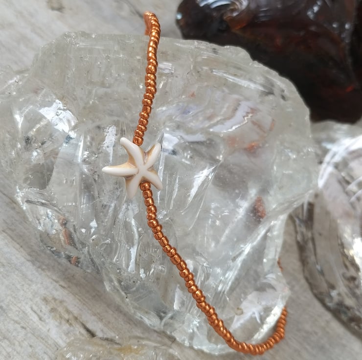 Shimmering orange seed beads thread onto elastic for an easy fit with a cream starfish.