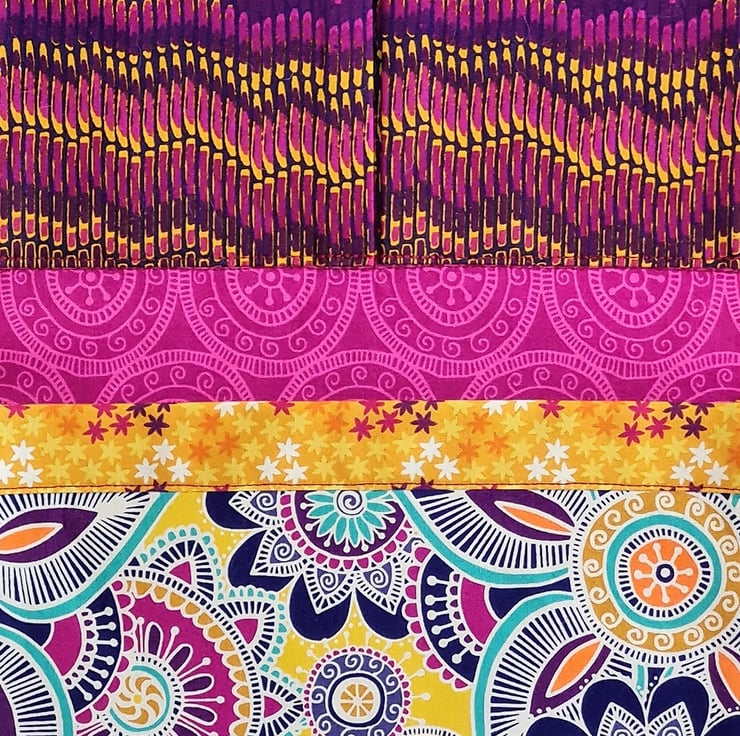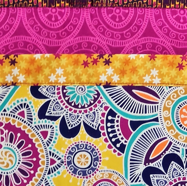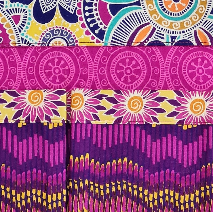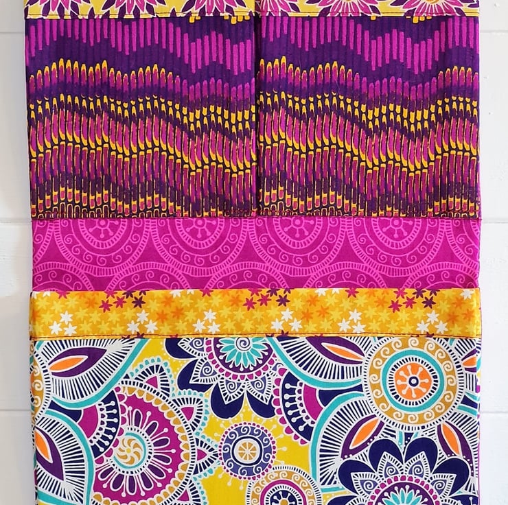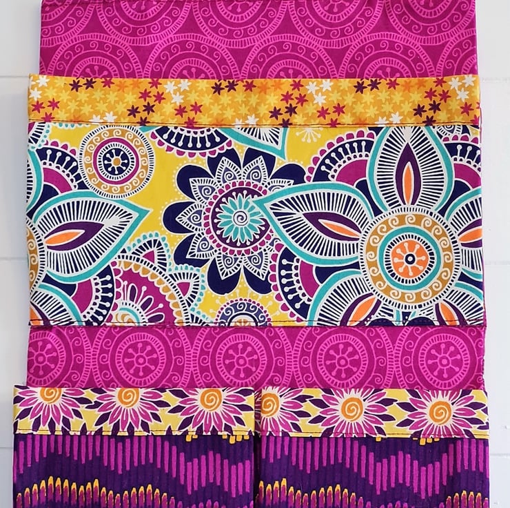 A very handy and useful set of hanging pockets made in the most bold and beautiful of fabrics. The organiser has three pockets, with the middle one being divided into two. The pockets are strengthened and due to side pleating have a useful capacity. These bright 'jewel' fabrics are 100% cotton. The organiser is ready to hang on the sturdy metal D rings and can find uses anywhere in the home. The organiser measures approx 9 inches/23 cm wide and 23.5 inches/60 cm tall.