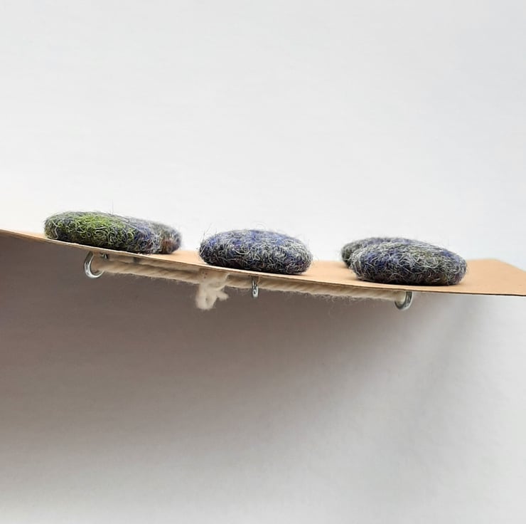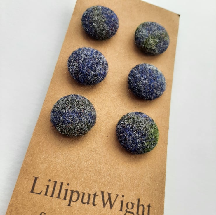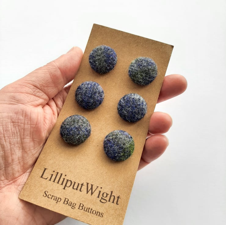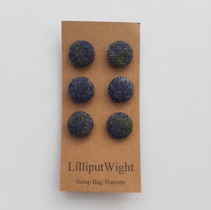 This set of six buttons are metal buttons covered with scraps of tweed fabric in shades of blue, purple and green. Each button is slightly different as it has been cut from a scrap of fabric and the pattern placement is different on each. Each button is around 2cm across.