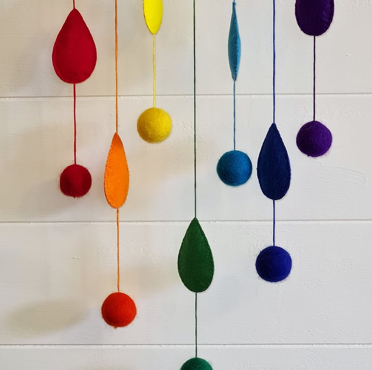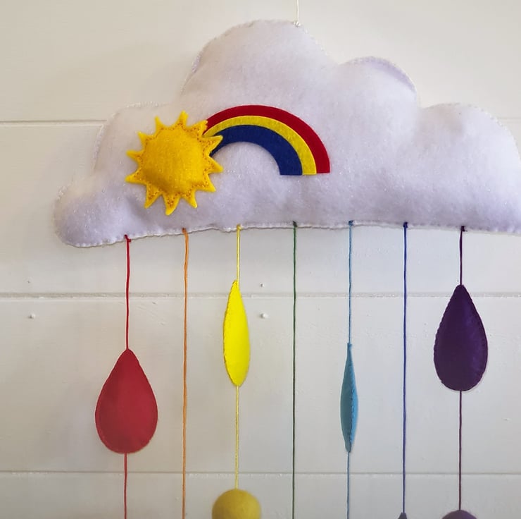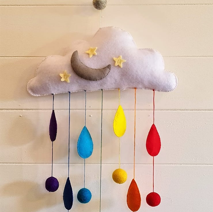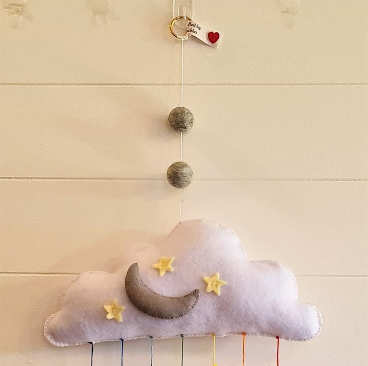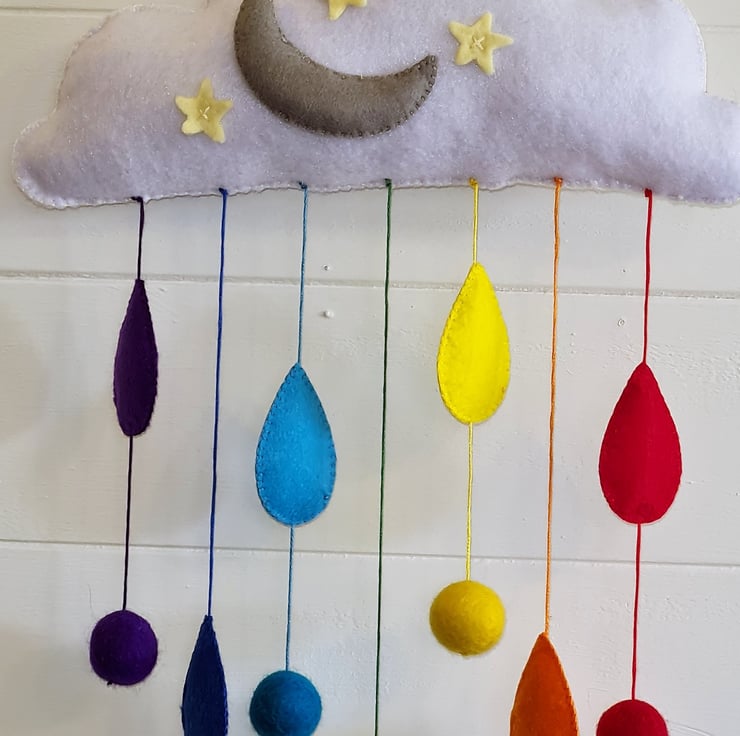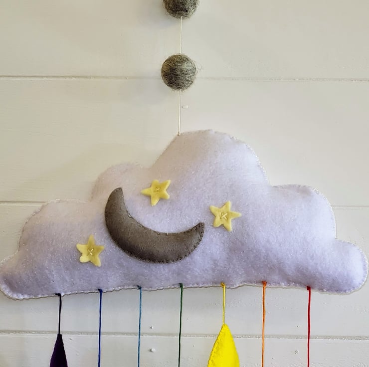 A cute cloud and rainbow mobile, handstitched in felt and trimmed with felt bobbles. The cloud and 'raindrops' are stuffed to give extra dimension. Both sides of the cloud are decorated. Can be hung as a mobile or as a wall hanging. The cloud is approx 11 inches/28 cm across at its widest point and from the hanging loop to the bottom bobble it measures 26 inches/66 cm.