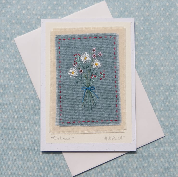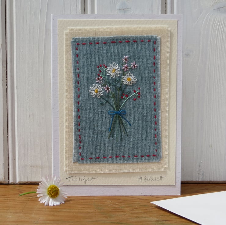 At dusk, the flowers in my cottage garden gradually fade as the light drops, but the white flowers remain bright for ages. I decided to embroider flowers as they appear at twilight. The design is therefore entitled 'Twilight'