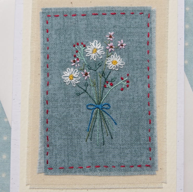 This is a small handmade greeting card featuring miniature hand-stitched flowers tied with a bow. The flowers are worked delicately in a variety of stitches. It is definitely a card to keep, suitable for almost any occasion! (perfect to frame too!)
