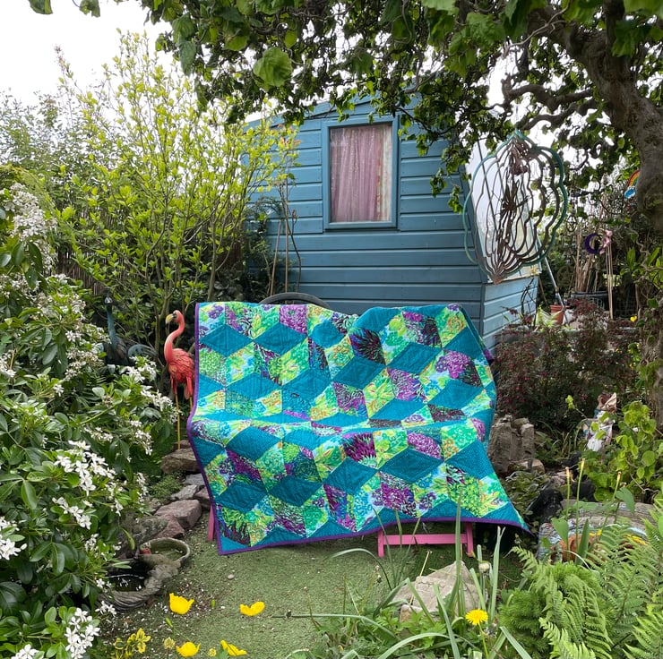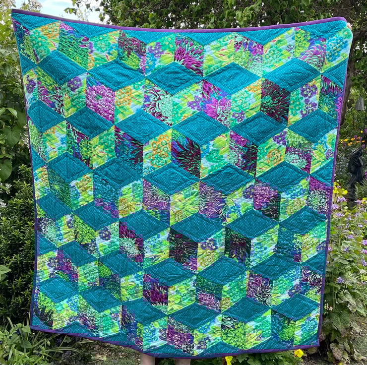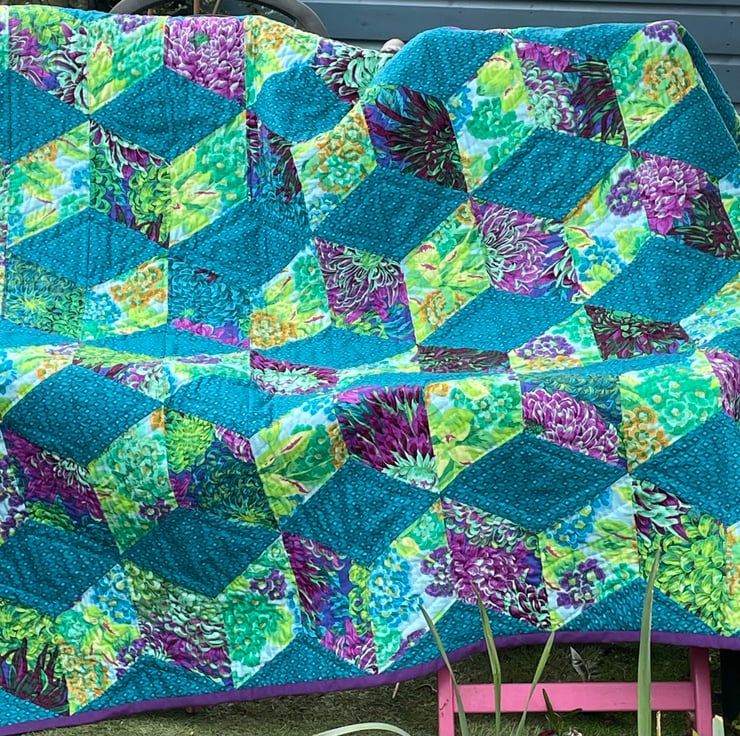 This unique and striking purple and green tumbling block quilt, was pieced and hand quilted by me, it measures 145 cm ( 57 inches) by 140 cm ( 55 inches).