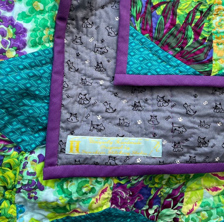 The quilt top is made using primula and chrysanthemum fabric by Philip Jacobs ( Kaffe Fassett collective fabric) and a coordinating print. The backing fabric is a neutral grey cotton with tiny black line dogs and white paw prints. The binding is dark purple cotton. The hand quilting follows the shape of the pieces, emphasising the tumbling block design.
