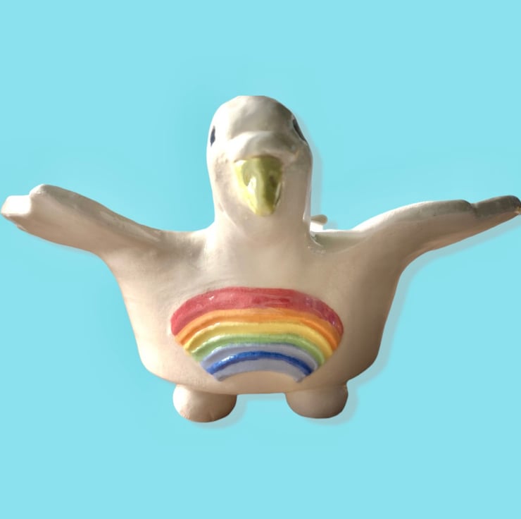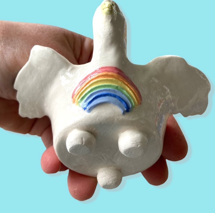 Created from white earthenware clay and clear glazed. Made using my own original hand made moulds with each head hand modelled . A hand painted rainbow on the chest completes this cute collectible .