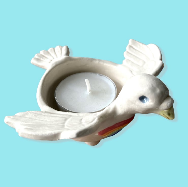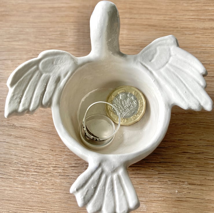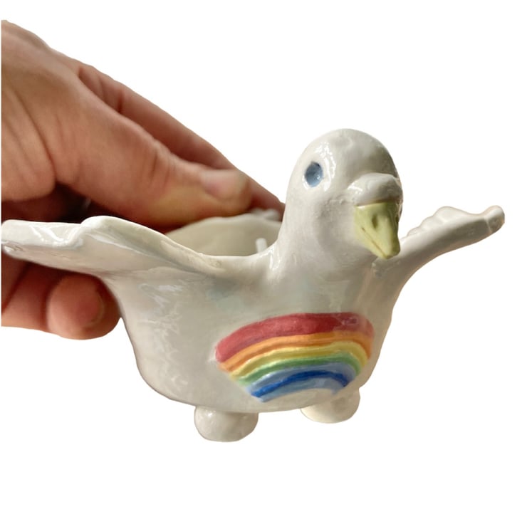 Hand made ceramic dove with a cup body and little feet . The tail serves as a handle making it perfect for a tea light or cone incense or can be just for a trinket keeper.