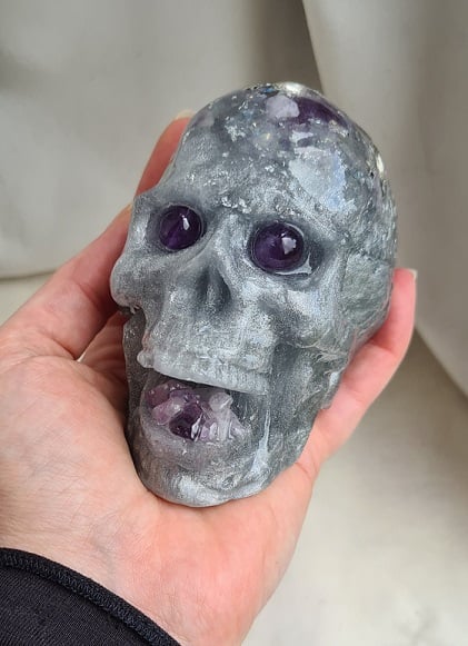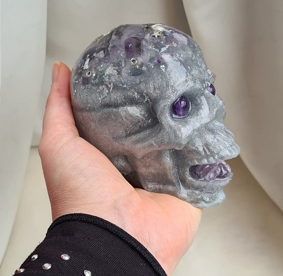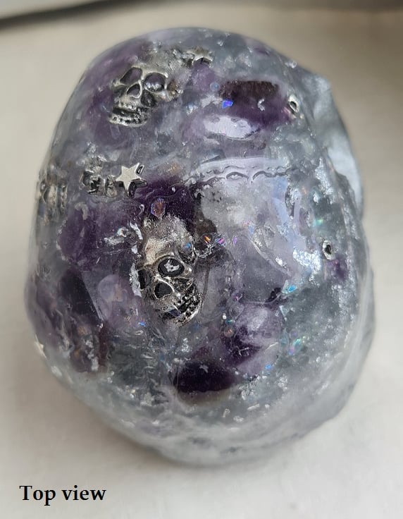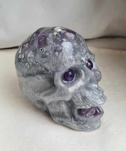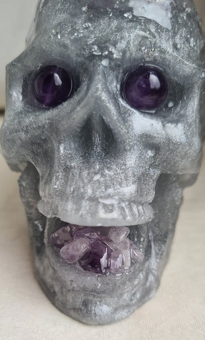 I love Skulls and with Resin the possibilities in design are almost endless. I also love Amethyst, the purple tones range from light to very dark in this piece.