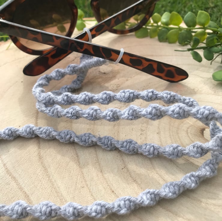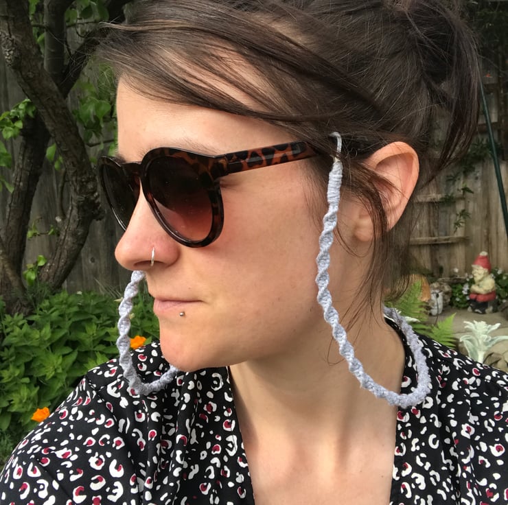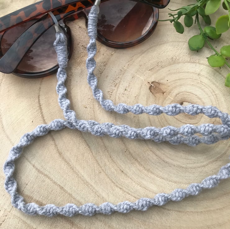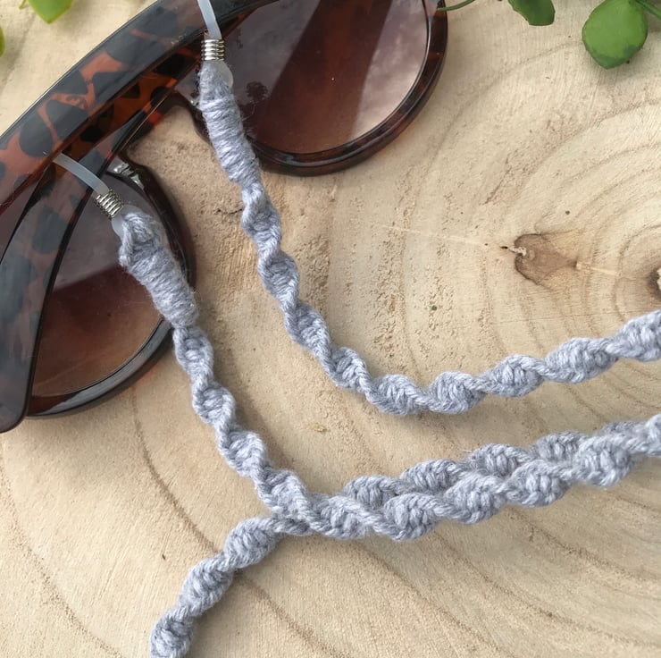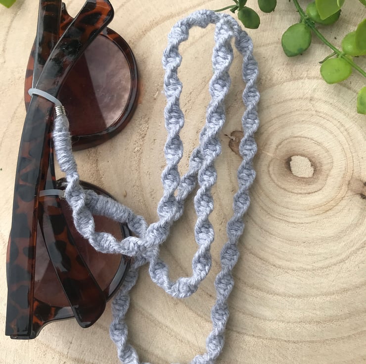Twisted sunglasses/glasses hanging cord/chain made with light grey recycled cotton cord and finished with clear loops on each end, to easily slip onto any glasses.