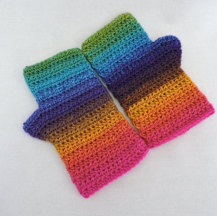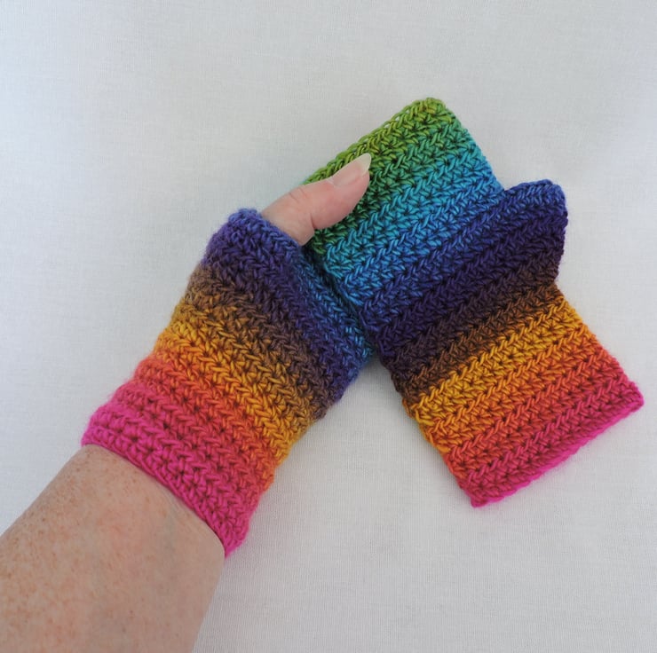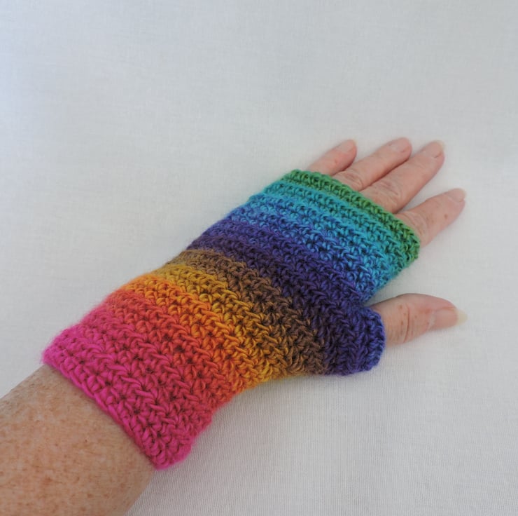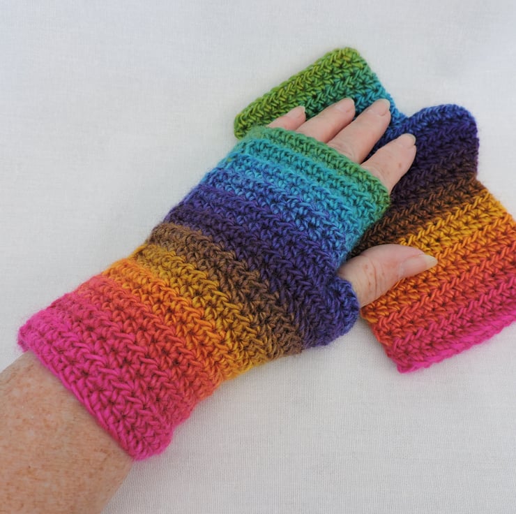 These fingerless mitts for adults have been made using a double knit self striping acrylic yarn. A host of tropical colours, green, turquoise, mauve, purple, chestnut, golden yellow, orange and hot pink. They have a plain body. A soft and colourful winter warmer, ideal for dog walkers and those who need to have their fingers free.