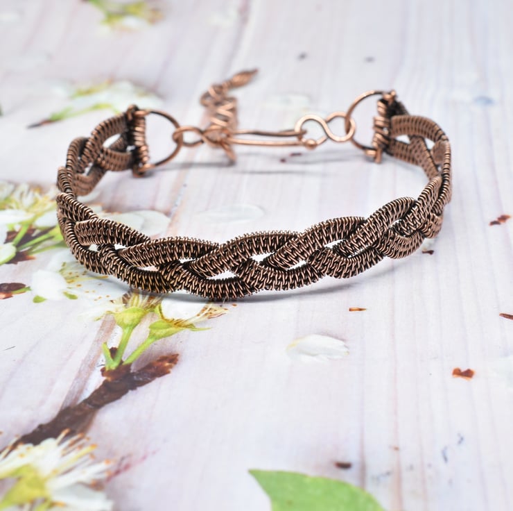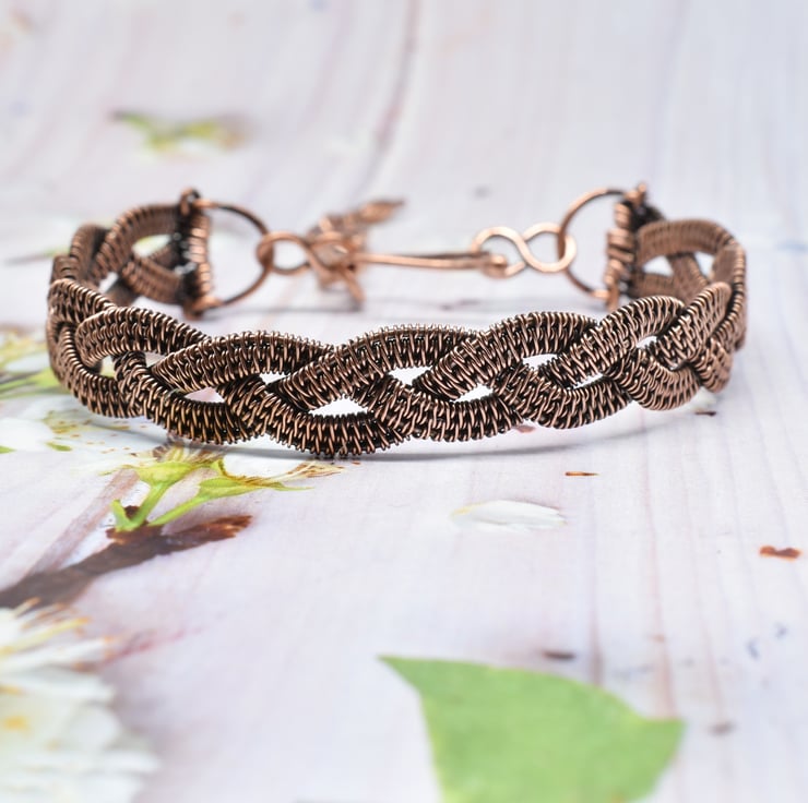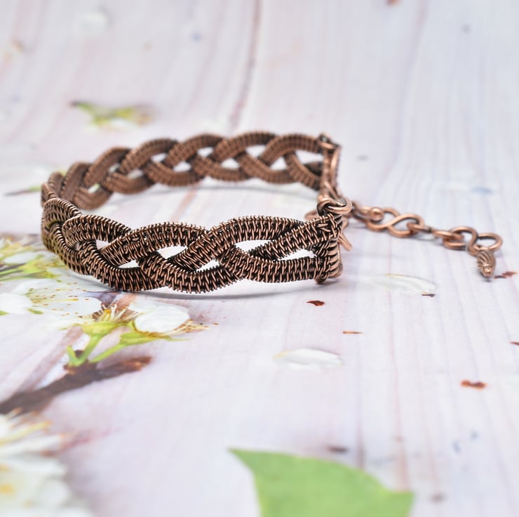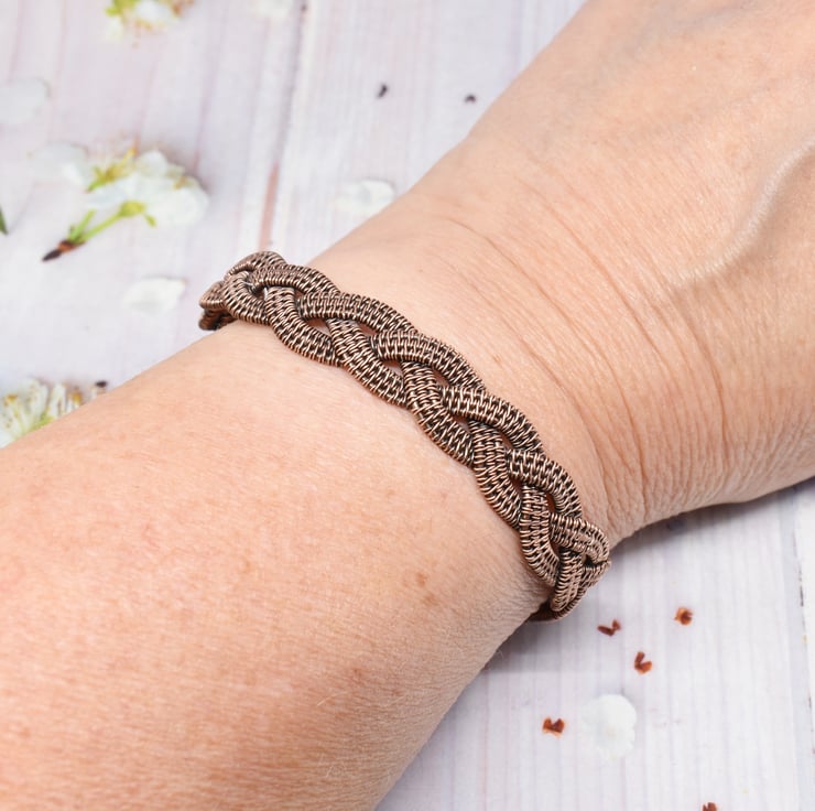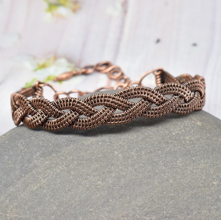 I have hand woven three strips then braided them together to form the cuff which is approximately 11 mm (7/16 inch) wide.