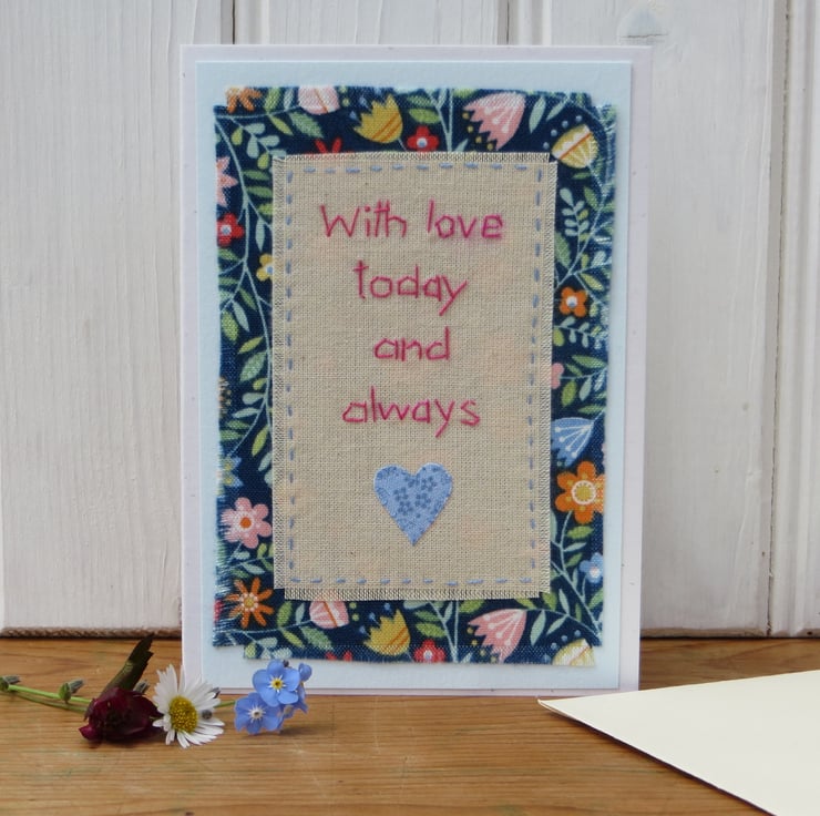 For this card I have embroidered the words 'With love today and always' adding a little applique heart. I then stitched the embroidered panel to a lovely piece of pretty floral cotton print fabric for the background.