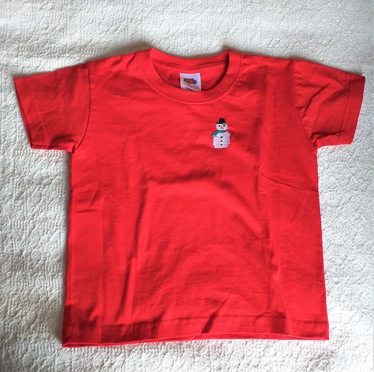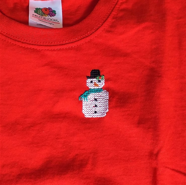 I have hand stitched a snowman with a kingfisher scarf and holly with berries on his hat on the front of a scarlet T-shirt by Fruit of the Loom. I never use a backing fabric when embroidering kids' clothing, so there is nothing inside the shirt to irritate your child's skin. The shirt has short sleeves, is 100% cotton and machine washable (though due to its deep red colour, I would be inclined to cool wash away from light colours!)