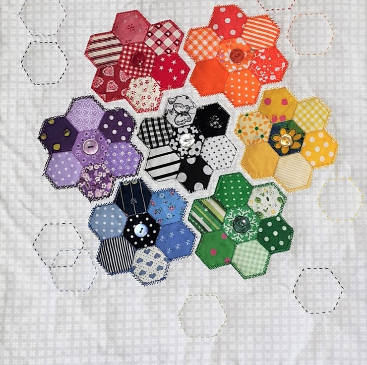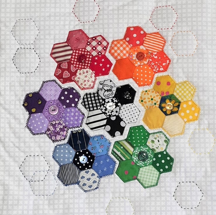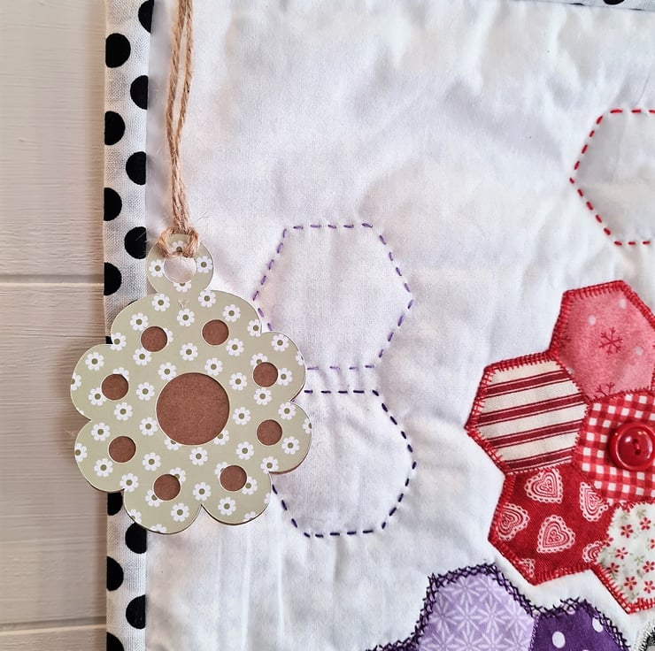 A total of 49 small hexagons in all shades of the rainbow make up this glorious quilted wall hanging, with a bit of black and white to mix it up a bit. The hexagons are appliqued using a variety of dainty stitches and the centre of each group is trimmed with a vintage button. A few extra hexagons have been handstitched around the edge. This quilt is full of pattern and colour - perfect for a rainbow fan! It is bound and backed in co-ordinating fabric and comes ready to hang with a dowel and ribbon. There is even a gift tag attached with a cute little pin. The quilt measures approx 16 inches/41 cm wide and 18 inches/46 cm tall. This stitchery is unique - we might make some more but there won't be one exactly like this!