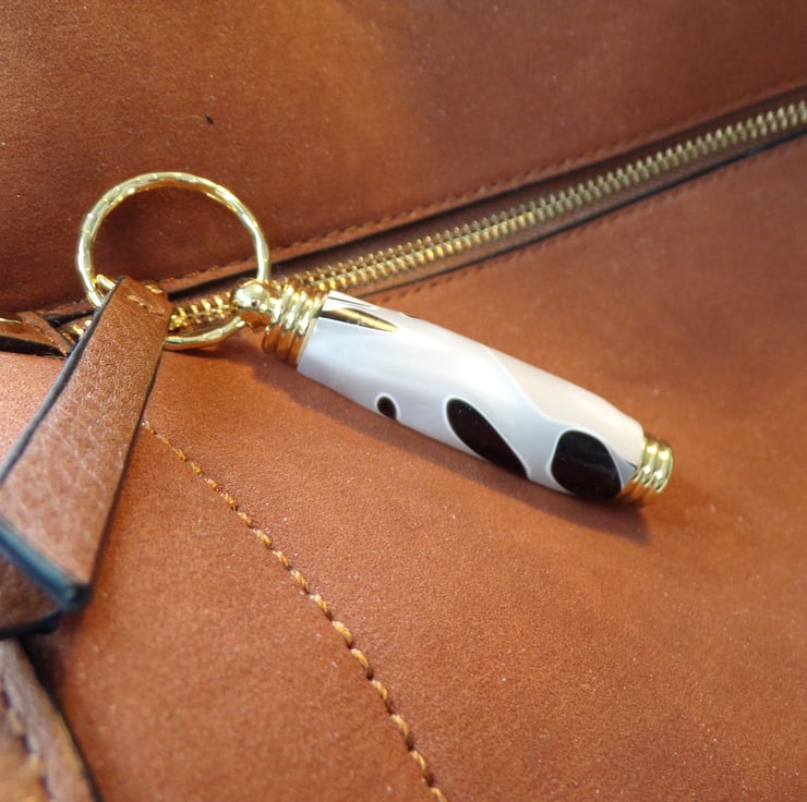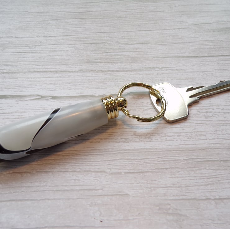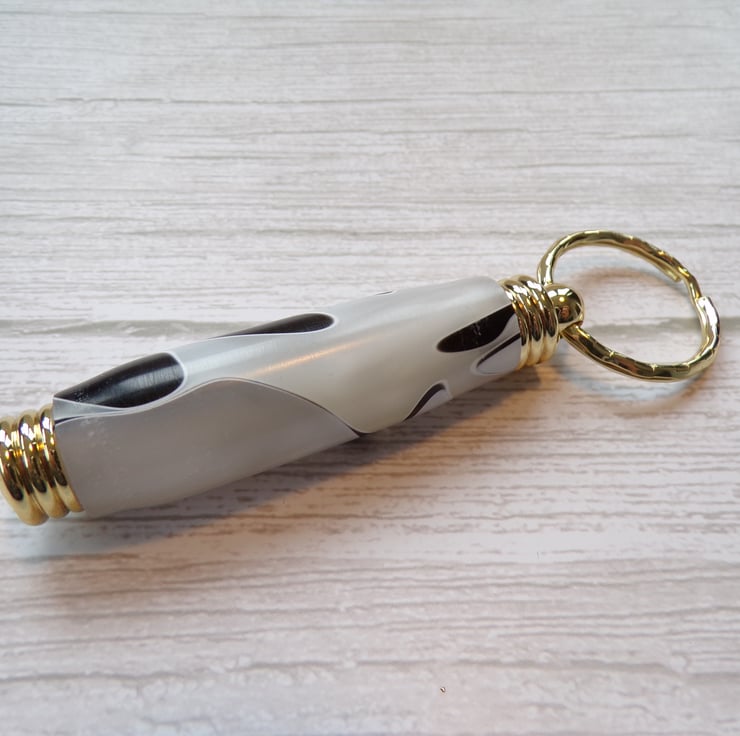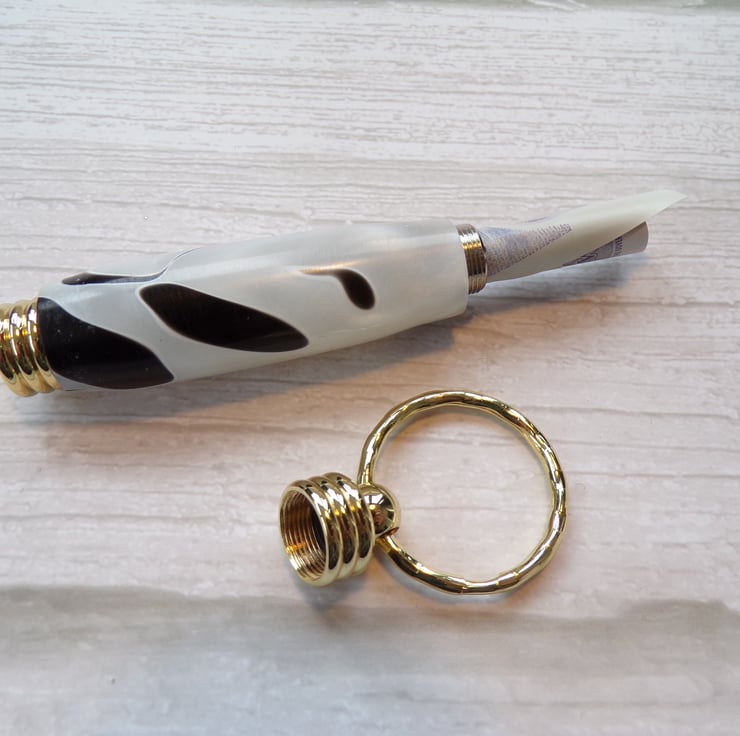 A keyring or bag charm with a difference. The top unscrews to reveal a hollow tube. Ideal for putting a note inside for someone special or some emergency money when needed. Attach to your bag or to a pendant chain, dance the night away and know you have your taxi fair home. Perhaps your medication for the day. The list is as long as your imagination.