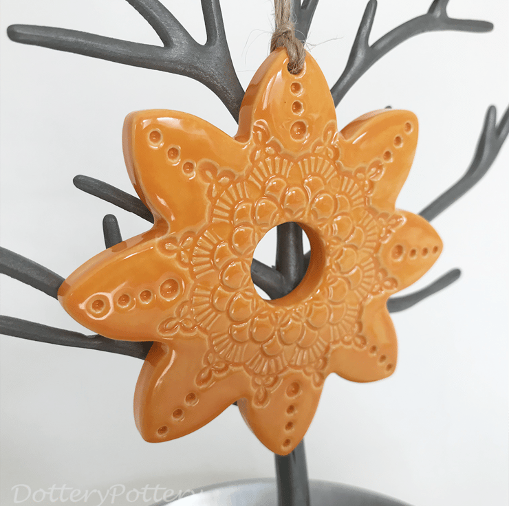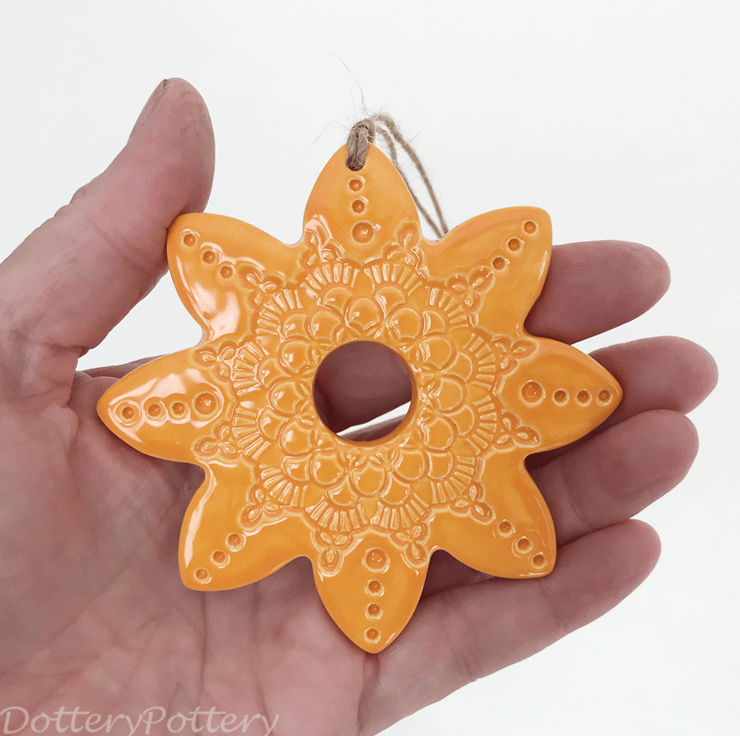 This flower deoration is made from white earthenware clay, imprinted with pattern and finished with a bright, glossy glaze. It has been fired twice, once to the bisque stage and then a second firing for the glaze. It measures 7cm across x 5mm thick.